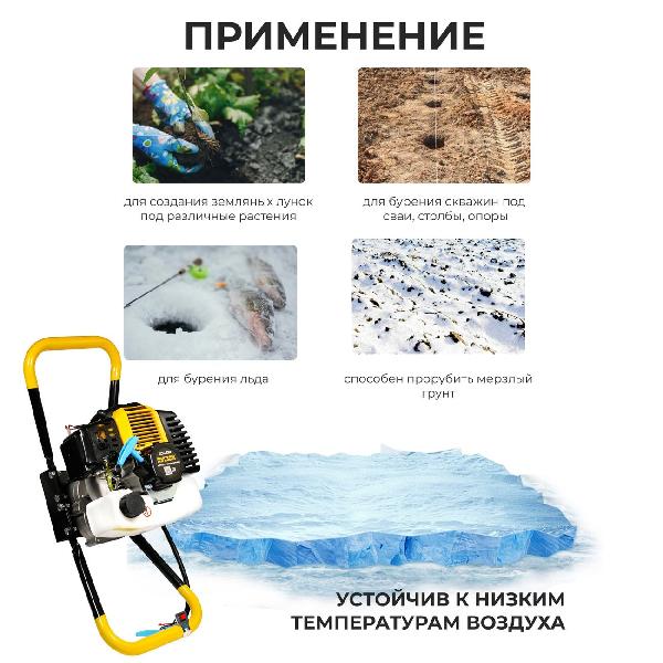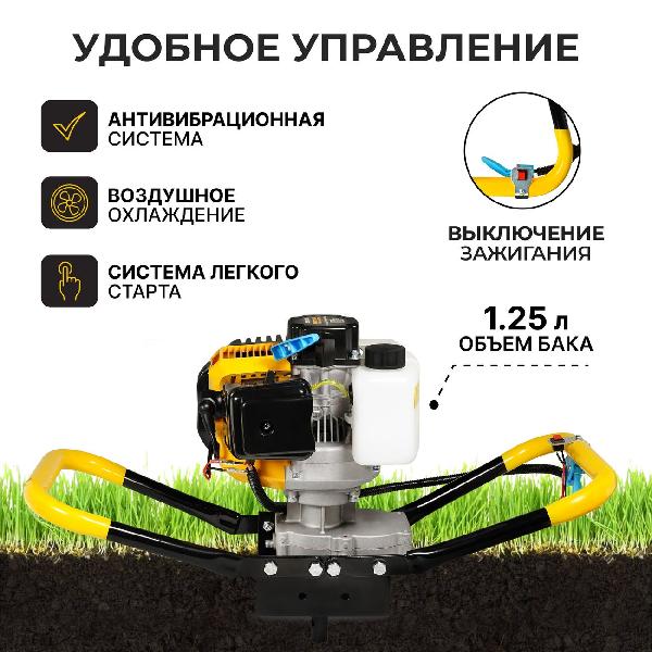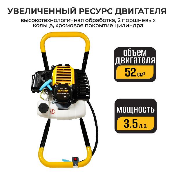 Мотобур Partner for Garden EDG 520 предназначен для проделывания лунок определенного размера во льду, земле, в том числе в зимнее время. Модель оборудована двухтактным двигателем объемом 52 м³, мощностью 3,5 л. с. Прибор работает на бензине. Объем топливного бака — 1 л. Расход составляет 0,7 г/кВт*ч, поэтому заправлять его часто не придется. Поставляется без шнека. Устройство совместимо с бурами разного диаметра. Элементы управления расположены на корпусе, что обеспечивает дополнительное удобство во время работы. Размеры инструмента — 29,5х27х39 см, вес — 8,45 кг.