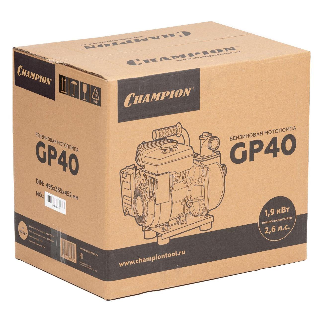 Вы можете купить Мотопомпа Champion GP40 в магазинах М.Видео по доступной цене. Мотопомпа Champion GP40: подробное описание, фото и отзывы реальных покупателей, характеристики, возможность скачать инструкции и подобрать аксессуары.