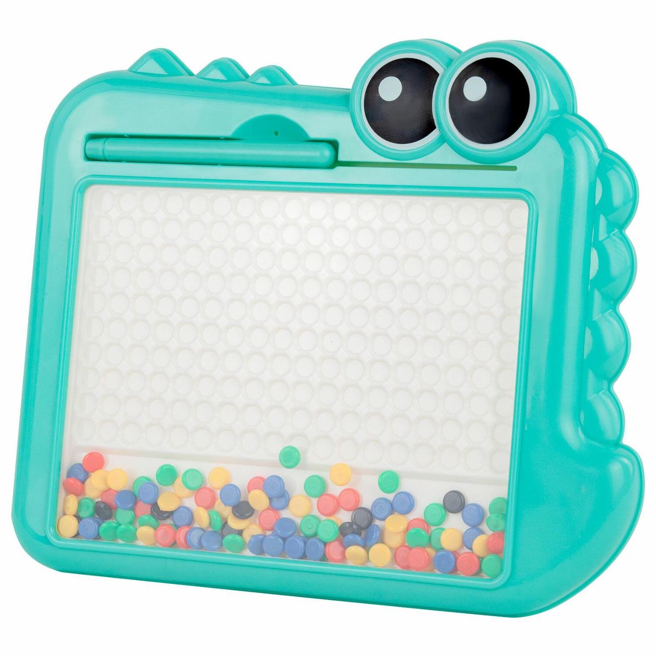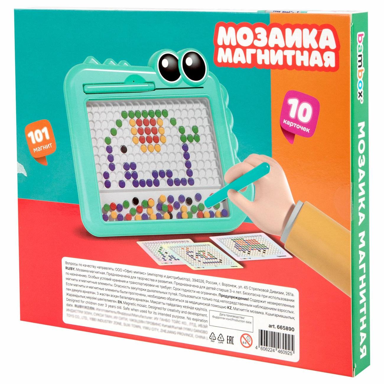 В набор входит игровое поле в виде крокодила, изготовленное из прочного ABS-пластика. Игровое поле накрыто прозрачным акриловым экраном. На игровом поле предусмотрено 180 ячеек для цветной мозаики. Под акриловым стеклом располагается цветная магнитная мозаика в количестве 101 штуки. В комплект также входит стилус из ABS-пластика с магнитным наконечником и 10 двусторонних карточек с заданиями.