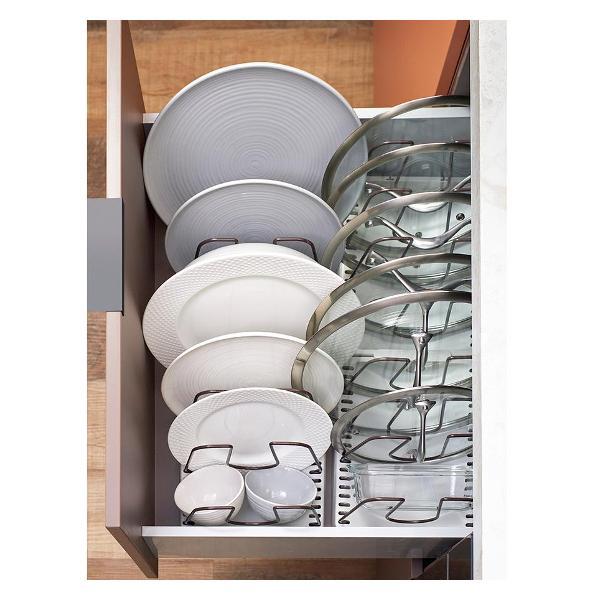 Органайзер Ronja имеет четыре регулируемых разделителя, что обеспечивает удобное размещение посуды и различных кухонных аксессуаров – тарелок, разделочных досок, кастрюль, сковородок и других предметов.