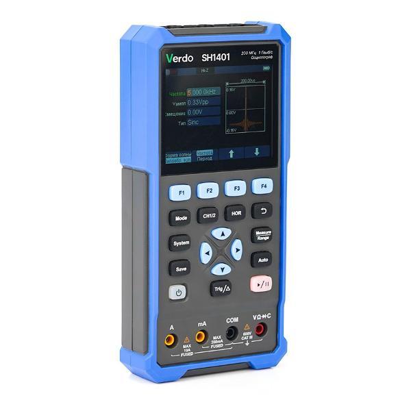 VERDO SH1401 - это портативный ручной осциллограф, который сочетает в себе функции двухканального цифрового осциллографа с полосой пропускания до 40 МГц и 4½-разрядного TrueRMS мультиметра.
