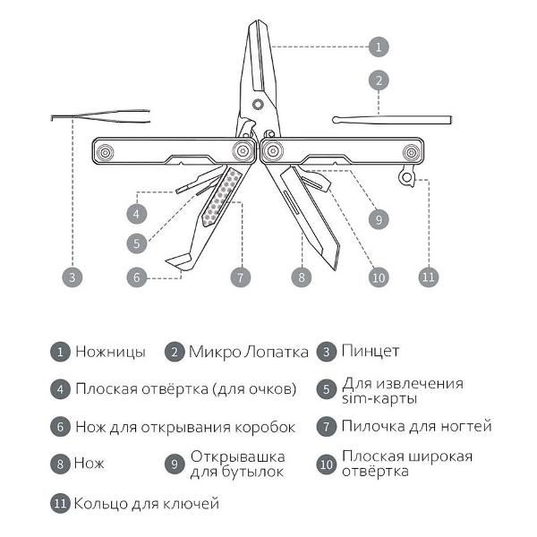 Мультитул Huohou Mini Multi-Tools HU0140 — карманный многопрофильный инструмент, выполненный в раскладном корпусе. Мультитул включает в себя 11 рабочих инструментов, среди которых нож, ножницы, отвертка, открывалка бутылок и пилка для ногтей. Все элементы выполнены из металла, рукоятка-корпус — пластиковая. Размер мультитула — 19х80х28 мм.