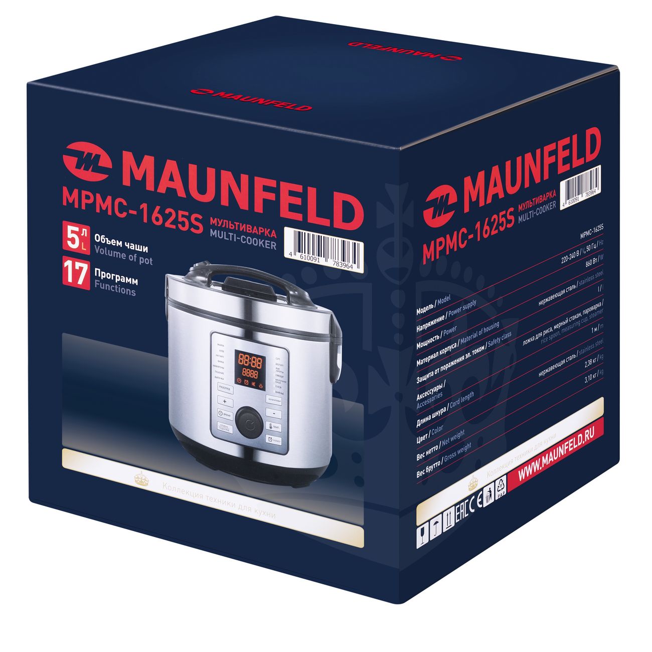 Maunfeld MPMC-1625S — мультиварка с 17 автоматическими программами. Объем чаши — 5 л, в ней есть антипригарное покрытие. Система управления — электронная. Есть приготовление на пару, стерилизация и разогрев.