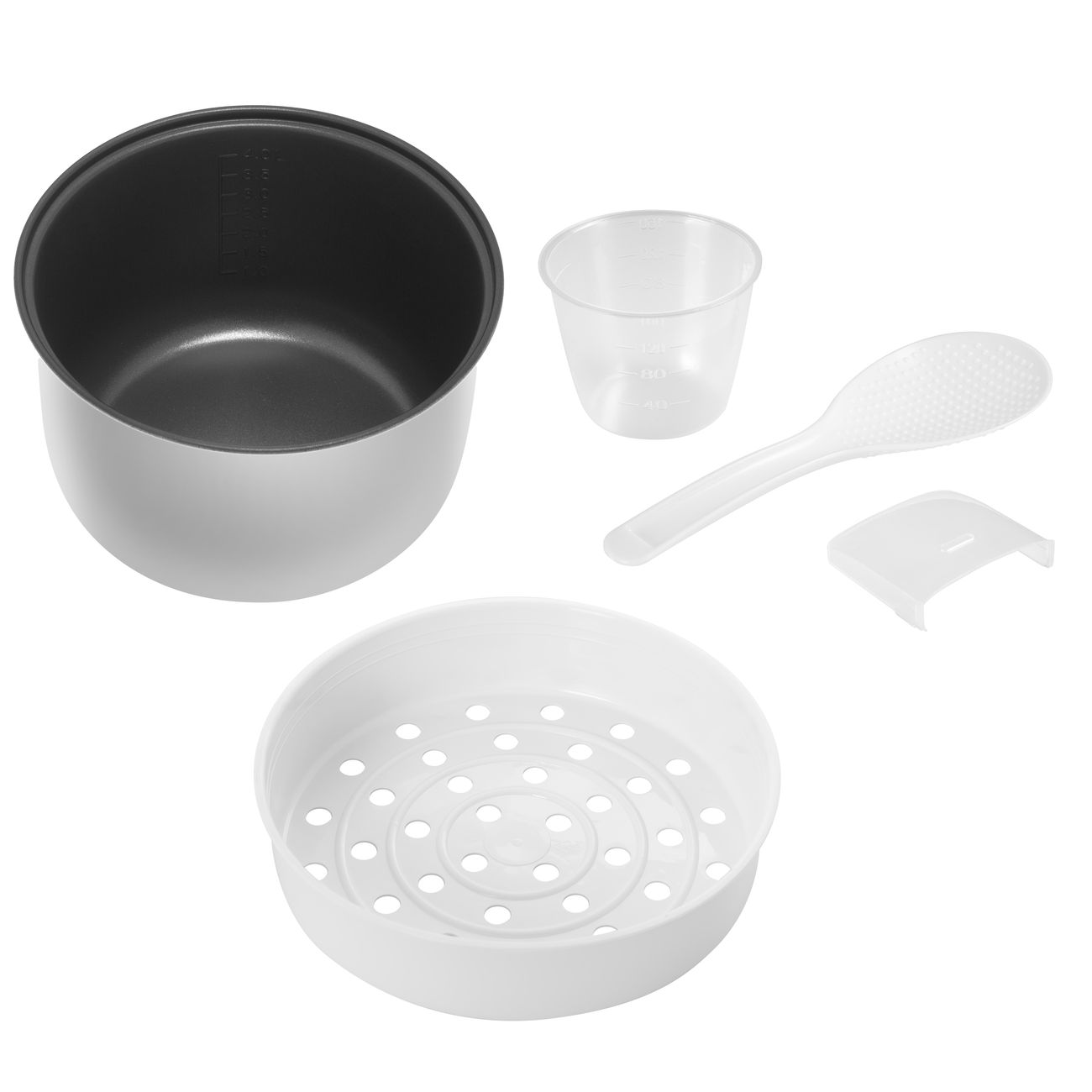 Максимальная мощность — 860 Вт. Сетевой шнур длиной 1 м можно отсоединять. В комплект поставки входят мерная ложечка, мерный стакан и контейнер-пароварка. Размеры этой модели — 28,5 х 28,2 х 26,4 см, вес — 2,52 кг.