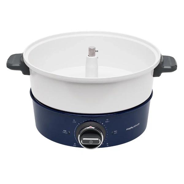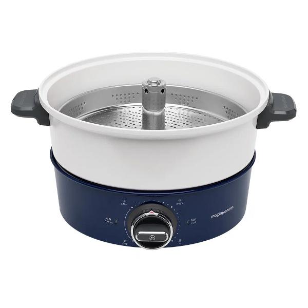 Мультиварка Morphy Richards 480006 бело-синего цвета обладает мощностью 1,5 кВт, для подключения к сети используется кабель длиной 1 м. В металлический корпус установлена чаша объемом 4 л с антипригарным покрытием, для доступа к которой необходимо открыть крышку: на ней установлена теплоизоляционная ручка, защищающая от ожогов.Управление мультиваркой осуществляется поворотным переключателем, установить температуру приготовления можно от 70°С до 230°С. Мультиварка может быть использована в качестве духовки. Модель комплектуется силиконовой рукавицей и решеткой для приготовления во фритюре и на пару.