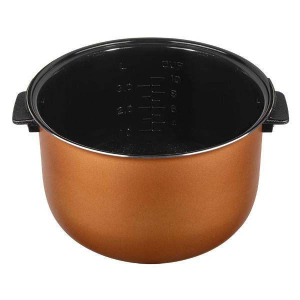 Емкость имеет качественное антипригарное покрытие, устойчивое к высоким температурам. Главное преимущество конструкции — наличие жаропрочных ручек. Горячую чашу можно безопасно извлечь из корпуса сразу после приготовления, не используя прихватки.