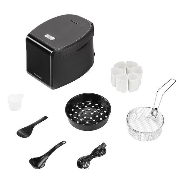 Вместе с устройством поставляется набор аксессуаров, редко встречающийся в базовых версиях: корзина для жарки во фритюре и комплект из 6 баночек для домашнего йогурта. Также присутствуют контейнер для пара, черпак и плоская ложка.