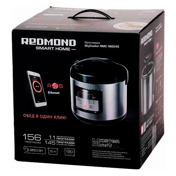 Мультиварка Redmond SkyCooker RMC-M224S представлена черном корпусе из пластика и металла со съемной крышкой и пятилитровой чашей с антипригарным покрытием. Оснащена функцией пароварки, 11 автоматическими программами приготовления блюд, режимами «Мультиповар» (с регулированием временного периода и температуры в диапазоне 35-180°С), «Стерилизация» и «Разогрев». Нагрев — электрический.