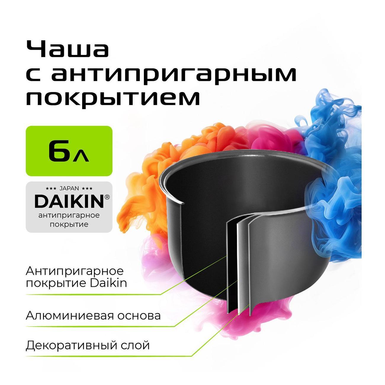 Позволяет готовить без масла, к поверхности не прилипают продукты. Покрытие не влияет на свойства, цвет и вкус продуктов, устойчиво к перепадам температур. Чашу можно очищать в посудомоечной машине
