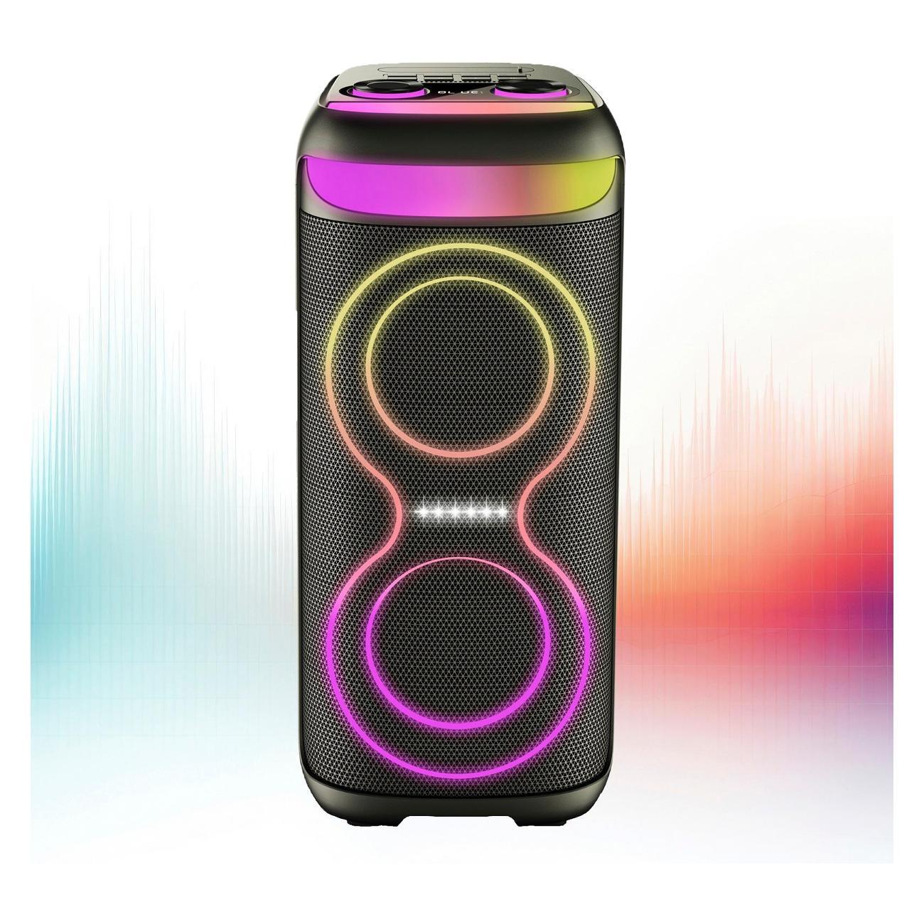 Интуитивно понятная панель управления, расположенная в верхней части корпуса, и пульт ДУ позволяют легко регулировать громкость, переключать треки и настраивать звук под свои предпочтения. Эффектная разноцветная подсветка поможет создать нужную атмосферу.