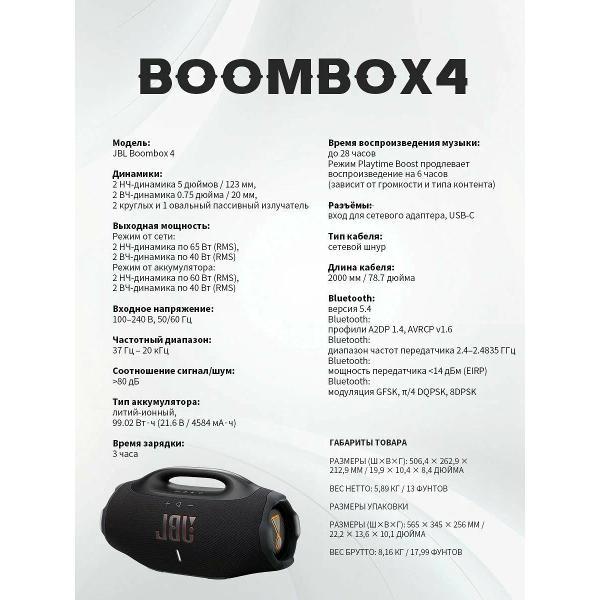 Покупал на замену третьему бумбоксу. Что могу сказать. Звук по качеству конечно земля и небо. Я немного расстроен, что продал тройку. Звук у тройки был очень приятный во всех частотах. Четвертая конечно в основном для улицы. Бас сочный. Сама громкая. Но на высокой громкости она задыхается. Так же как и от сильного баса. У тройки все было сбалансированно. Качество материалов у тройки было на высоте. Здесь же пожертвовали качеством для снижения ее веса. Да вес ощущается в разы легче. Но и осязательный эффект приятного ощущения качественных материалов ушел. На сколько долго хватит аккумулятора не скажу. Но заявленных часов на тройке не было. И тут думаю не будет. Так все ок. Продавец быстро отправил. Пришла с пломбами. Теперь для стереоэффекта и тот как то облегчить ее я заказал вторую четверку. У этого же продавца. Брать все рано рекомендую.