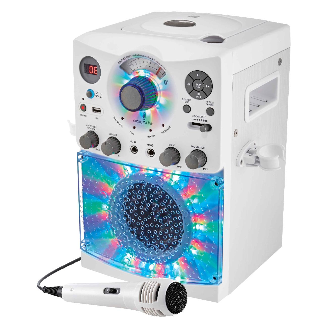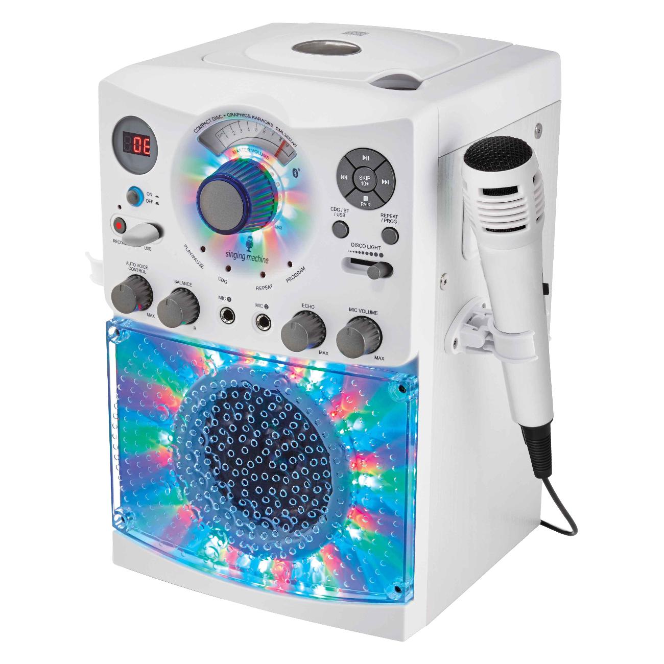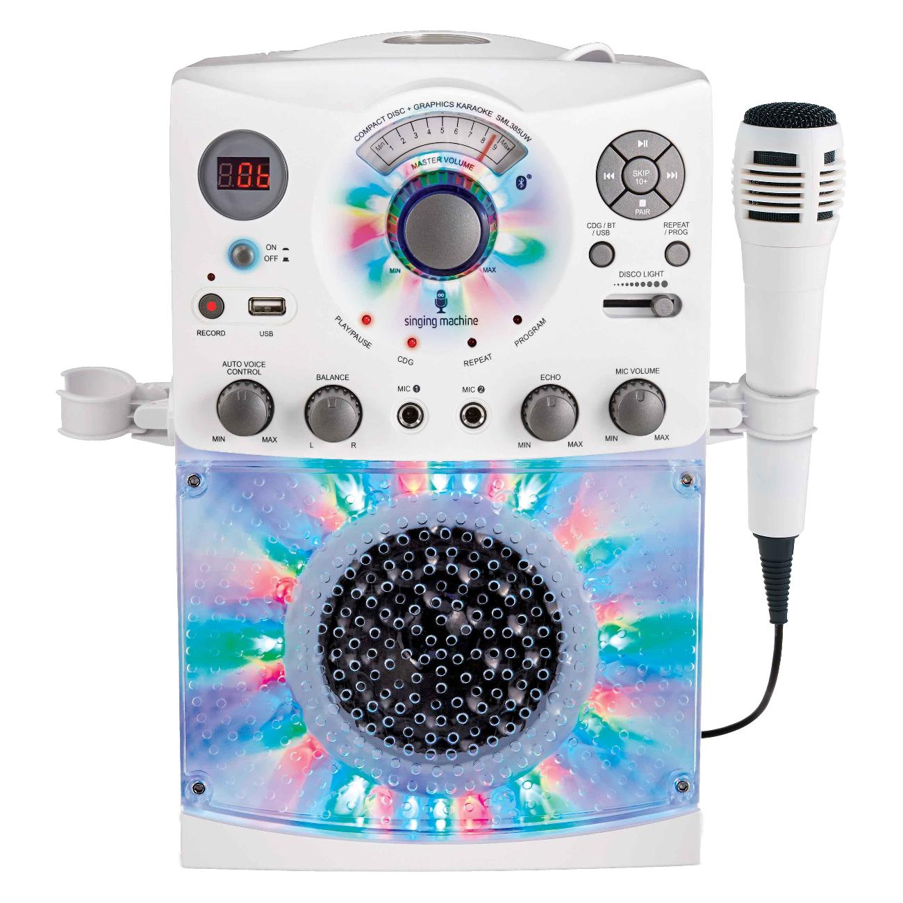Музыкальный центр-караоке Singing Machine SML385UW — мультимедийная система общей выходной мощностью 3,5 Вт, с поддержкой воспроизведения музыки с карт памяти, CDG, USB-носителей, ПК и других устройств. Связь по Bluetooth дальностью действия до 10 м позволяет передавать музыкальные треки дистанционно, с совместимых приборов. 54 светодиода Disco Light в корпусе проецируют огни на стены и потолок, создавая световое шоу в такт музыке. На ЖК мониторе отображаются тексты песен.