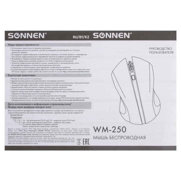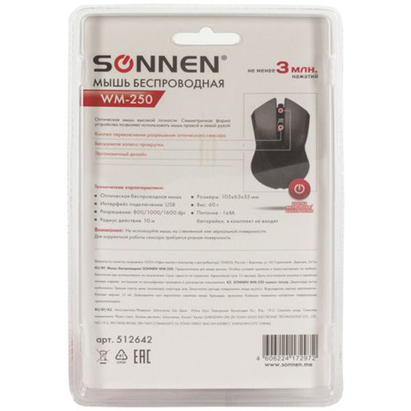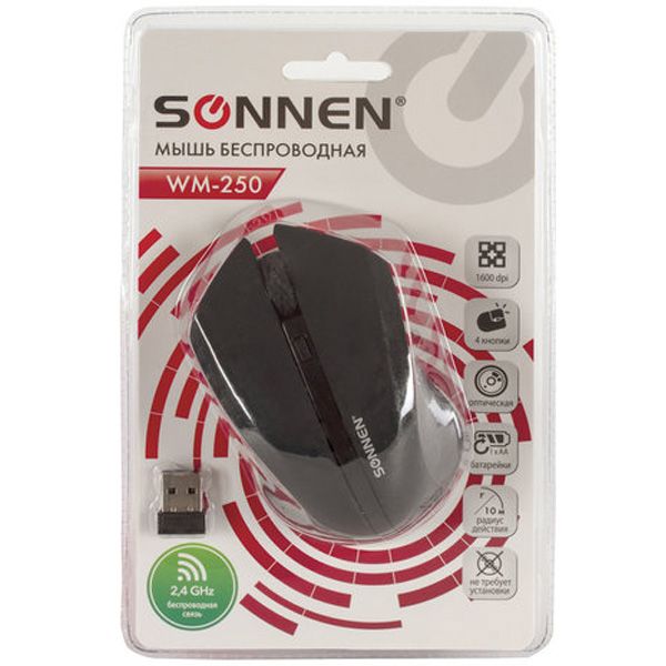 Беспроводная мышь Sonnen WM-250 работает от батарейки типа АА. Модель оснащена USB-разъемом и четырьмя кнопками. Разрешение оптического сенсора можно менять, радиус его действия составляет 10 м. Верхняя часть корпуса мыши покрыта специальным нескользящим покрытием Soft-Touch. При подключении мыши к компьютеру или ноутбуку не требуется устанавливать дополнительные драйверы.