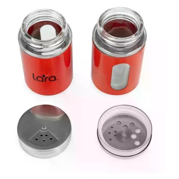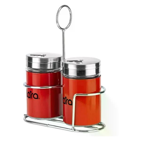 Набор для специй Lara LR08-05 - это практичный аксессуар для ежедневной сервировки стола. Набор изготовлен из высококачественной нержавеющей стали с комбинированным покрытием и обладает такими свойствами, как прочность и долговечность, отсутствие вкуса и запаха, нетокосичность. Набор выполнен в форме небольших баночек с крышками, объем баночки 100 мл. Через откручивающуюся крышку удобно засыпать специи, а благодаря прозрачному окошку можно контролировать их уровень. Для удобного хранения в комплект входит подставка из нержавеющей стали. Набор для специй можно мыть в посудомоечной машине. После мытья необходимо протереть и дать высохнуть.В наборе 3 предм (сталь, красн): солонка 1х100мл, перечница 1х100мл, подставка