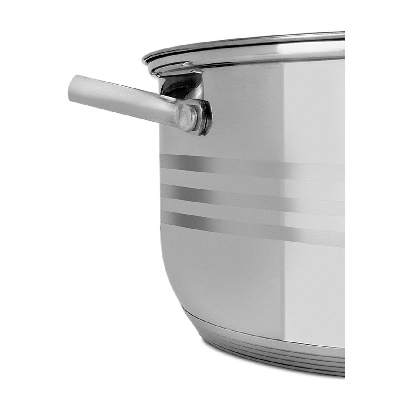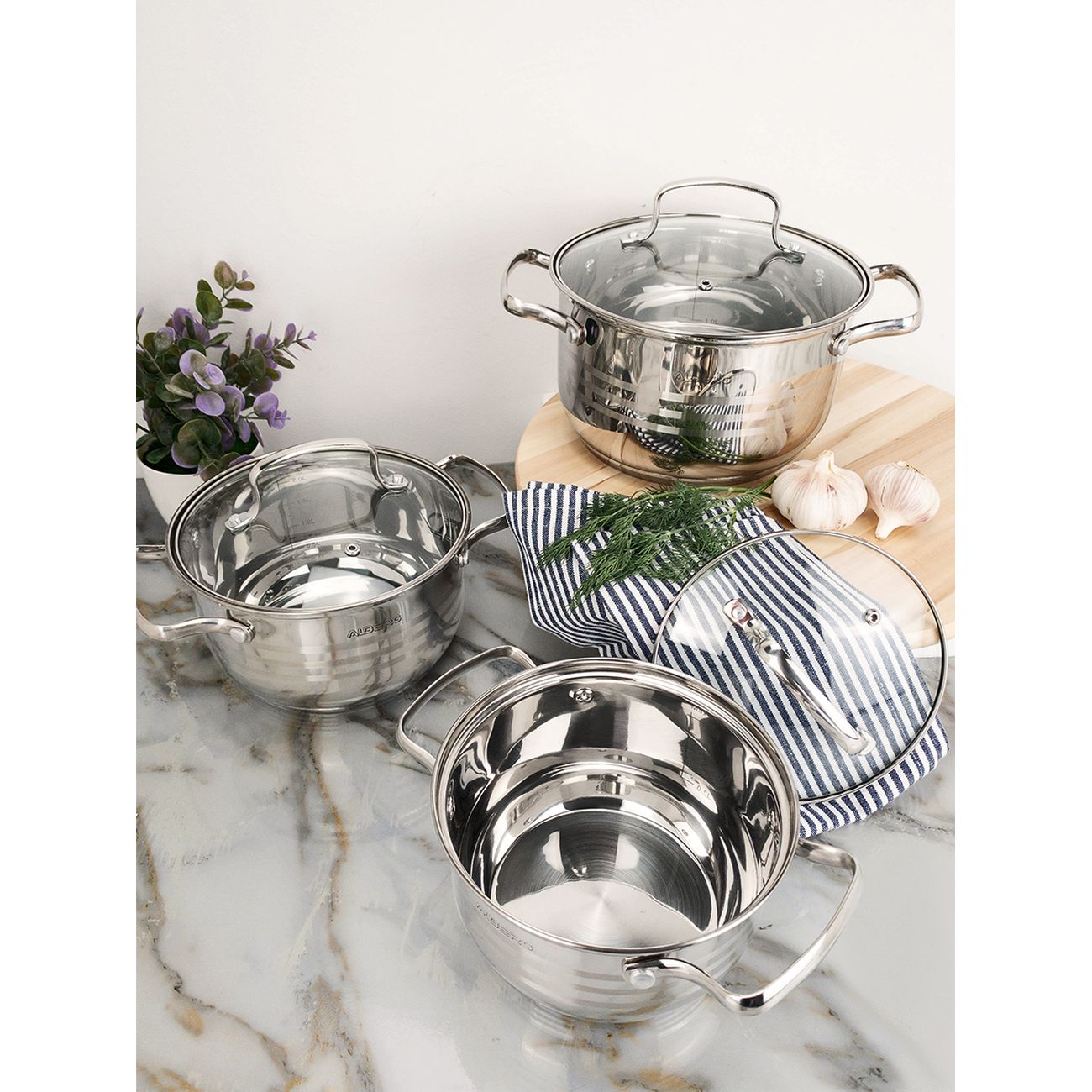 В комплект входят кастрюли на 2,5 л, 4,7 л и 6 л, а также три крышки, сделанные из жаропрочного стекла. Есть небольшие отверстия для выхода пара. Разрешено мыть под проточной водой, а также в посудомоечной машине с использованием специальных чистящих средств.