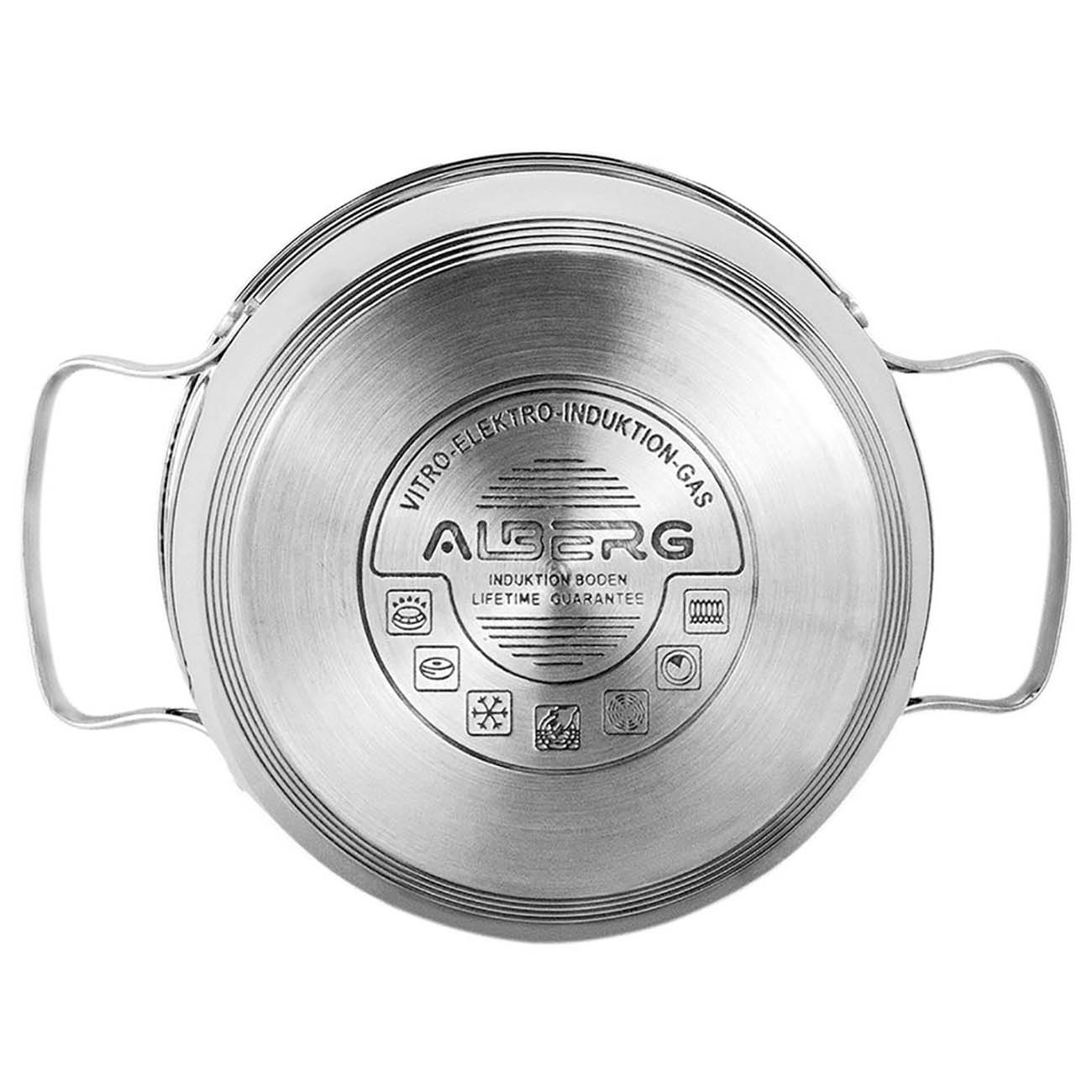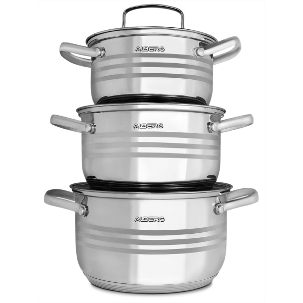 Набор кастрюль Alberg AL-2001 состоит из шести изделий, выполненных из металла, устойчивого к появлению коррозии. Вся посуда оснащена мерной шкалой. Толщина стенок составляет 0,5 мм, дна — 3 мм. Рабочая область нагревается равномерно и не выгибается при частом использовании. Можно нагревать на индукционных, электрических и газовых конфорках.