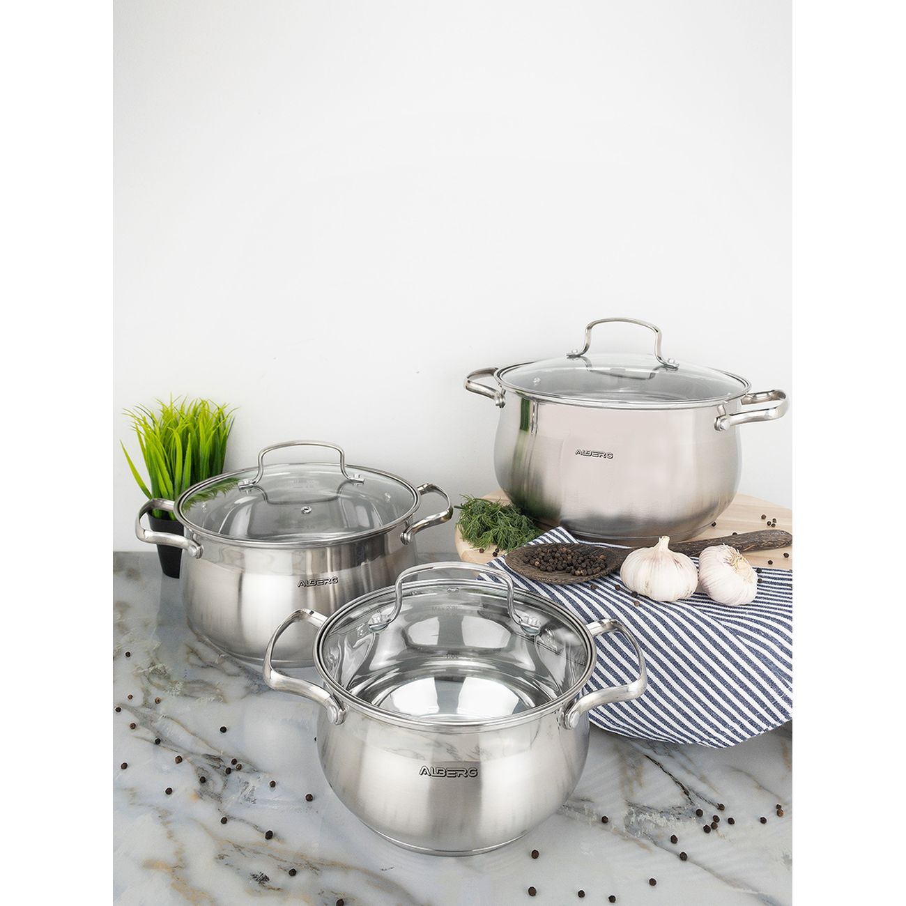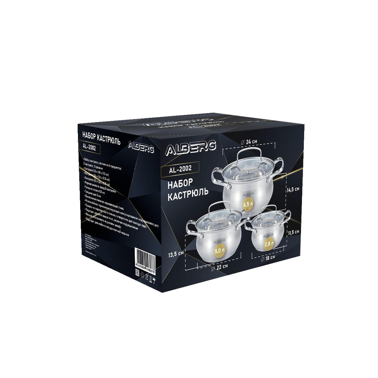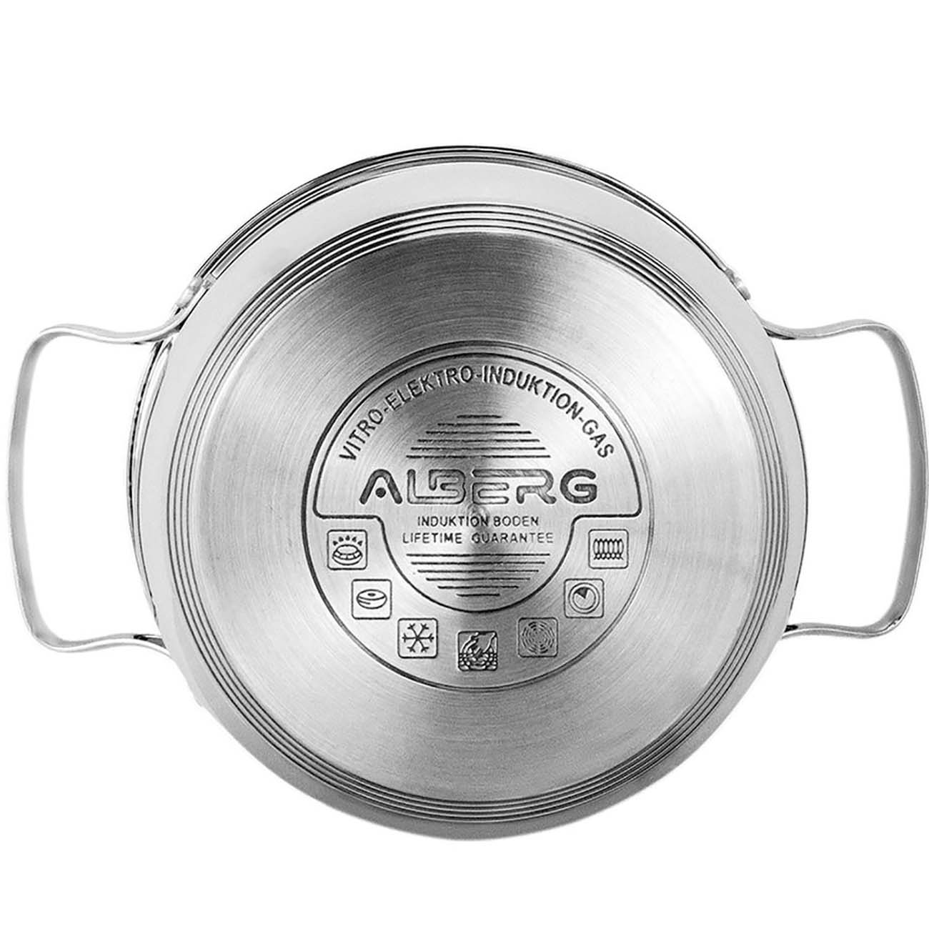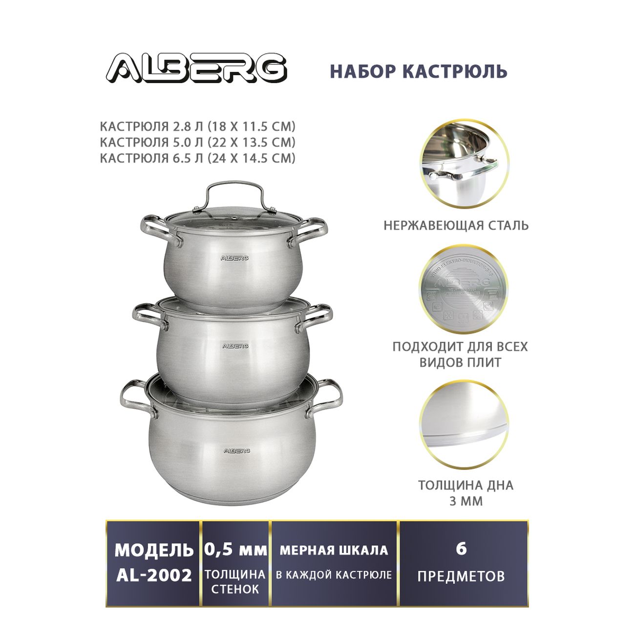 Набор кастрюль Alberg AL-2002 состоит из шести изделий, выполненных из металла, устойчивого к появлению коррозии. Вся посуда оснащена мерной шкалой. Толщина стенок составляет 0,5 мм, дна — 3 мм. Рабочая область нагревается равномерно и не выгибается при частом использовании. Можно нагревать на индукционных, электрических и газовых конфорках.