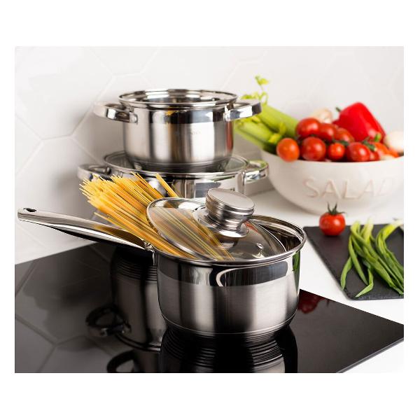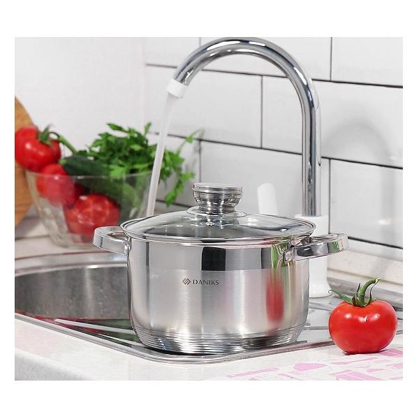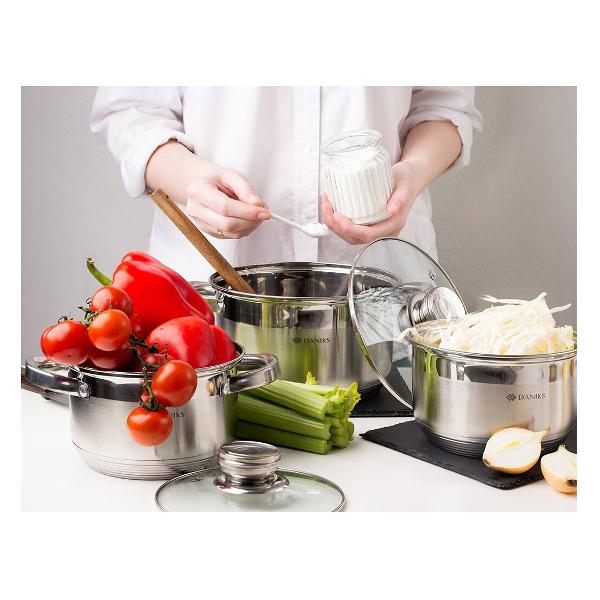Набор кастрюль Daniks «Стандарт» PR SD-6-2 — это три долговечных в эксплуатации изделия из нержавеющей стали в комплекте со стеклянными крышками. Металлический ободок по краю предотвращает появление сколов. Модели совместимы со всеми разновидностями конфорок и могут очищаться в посудомоечной машине. Кастрюли объемом 2 л, 2,9 л и 4 л с прочными и удобными для захвата стальными ручками подходят для повседневного приготовления блюд, в том числе отваривания овощей, макарон и пельменей. На внутреннюю поверхность корпуса нанесены отметки литража.