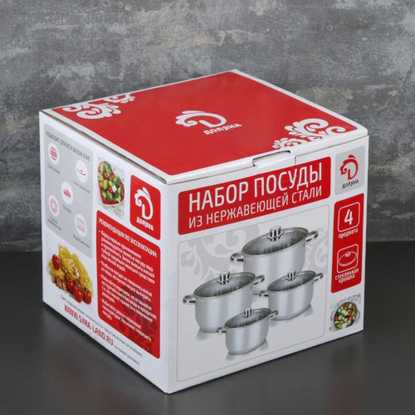 Набор «Доляна» «Гретте» состоит из четырех кастрюль разных объемов. Все предметы выполнены из прочной нержавеющей стали. Этот материал обладает высокой износоустойчивостью, не боится механических повреждений и коррозии.