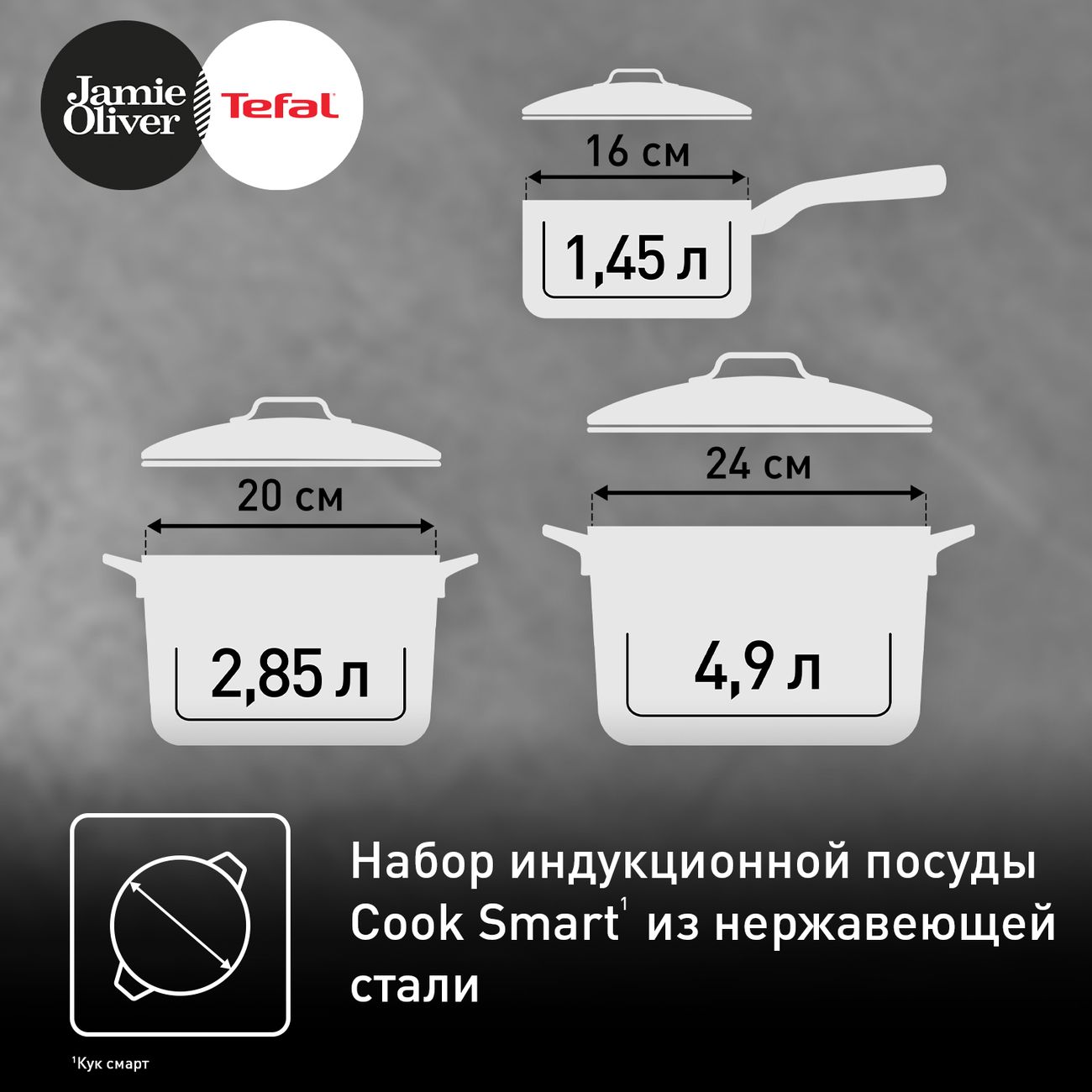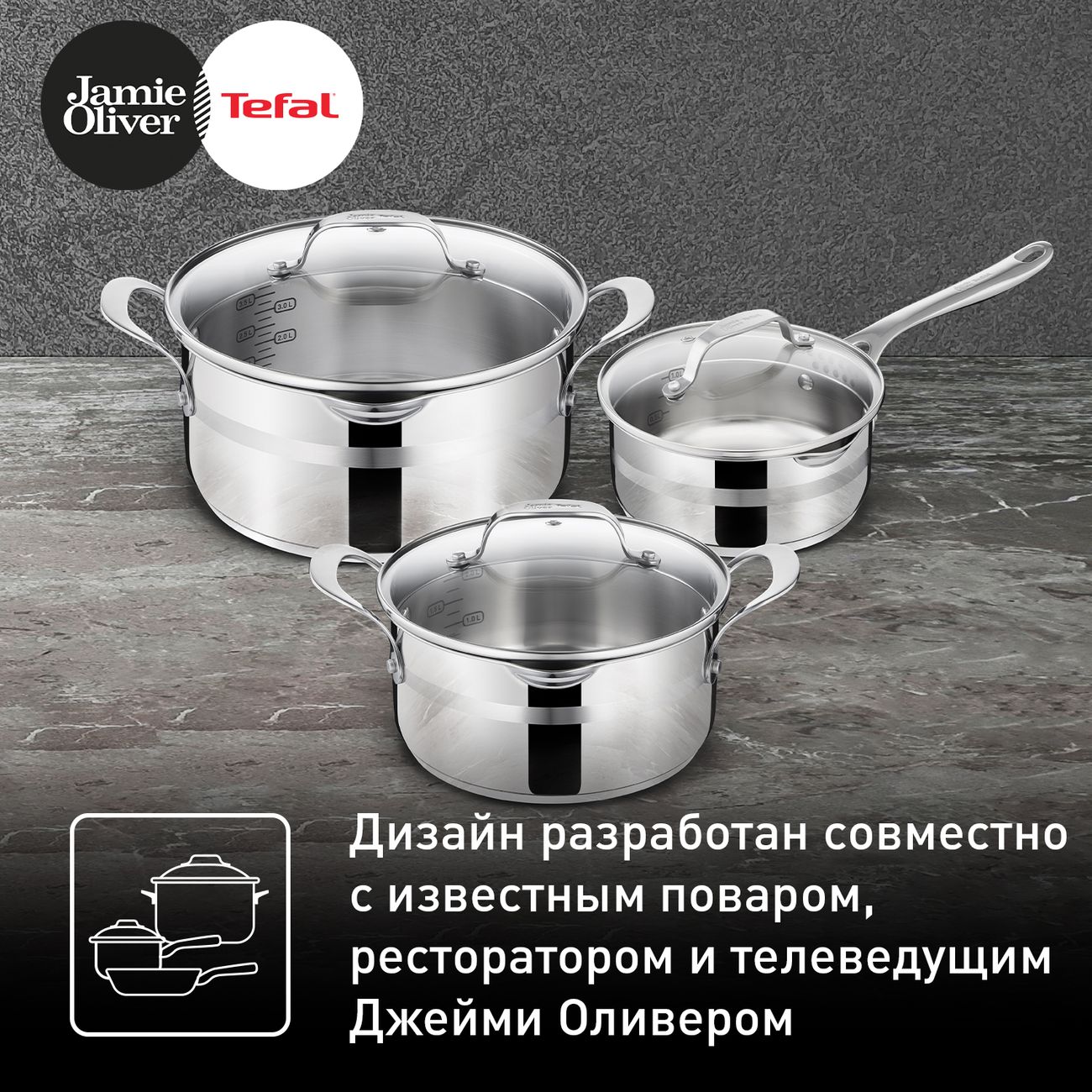 Набор посуды Tefal Jamie Oliver E311S674, состоящий из ковша и двух кастрюль с крышками, выполнен из нержавеющей стали с зеркальной полировкой, позволяющей надолго сохранить его внешний вид.