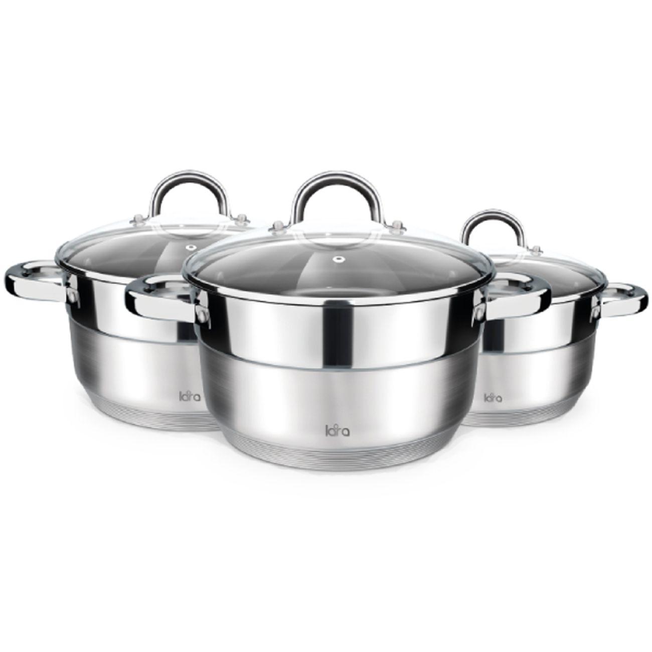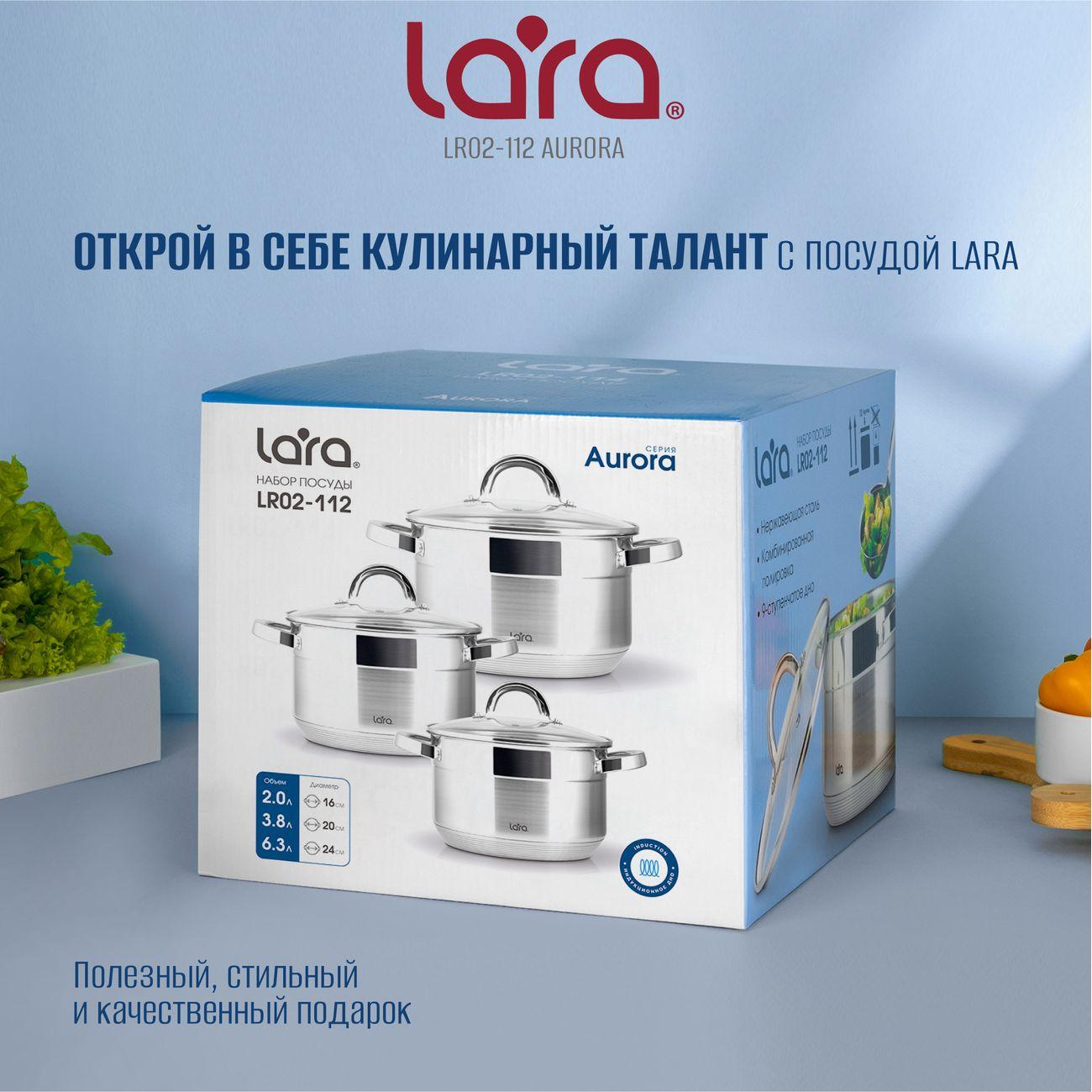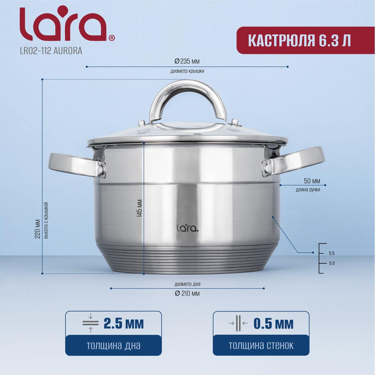 Набор посуды Lara Aurora включает две кастрюли объемом 2, 3,8 и 6,3 л. Они выполнены из нержавеющей стали ― износостойкого и прочного материала, не деформирующегося под регулярным воздействием высоких температур. Девятислойное капсульное дно позволяет использовать их на любых варочных поверхностях, в том числе и индукционных. Доступна очистка в посудомоечной машине.