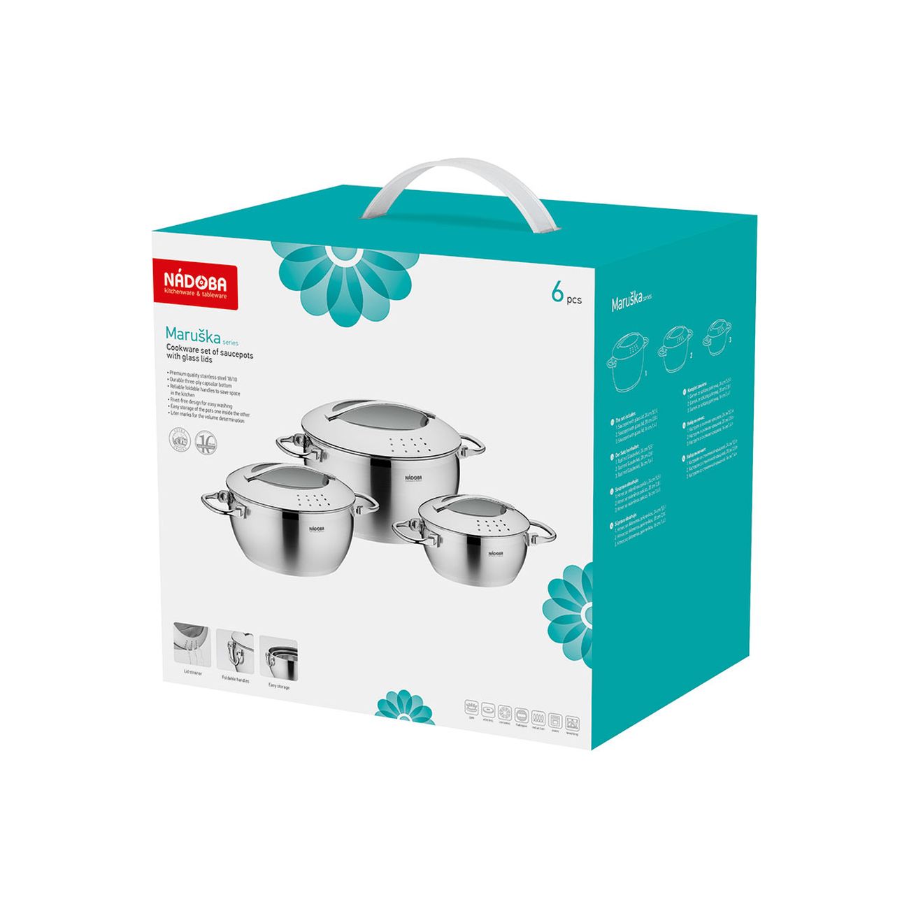 В набор кастрюль NADOBA серии Maruska входят: кастрюля с крышкой 5,5л/24см, кастрюля с крышкой 2,8л/20см, кастрюля с крышкой 1,4л/16см. Посуда выполнена из высококачественной нержавеющей стали 18/10 для любого типа плит, в т.ч. индукционных. Благодаря включению в состав материалов никеля и хрома, изделия обладают повышенной прочностью, более устойчивы к воздействию кислот и щелочей. Кастрюли не деформируются при частом использовании и не подвержены коррозии.