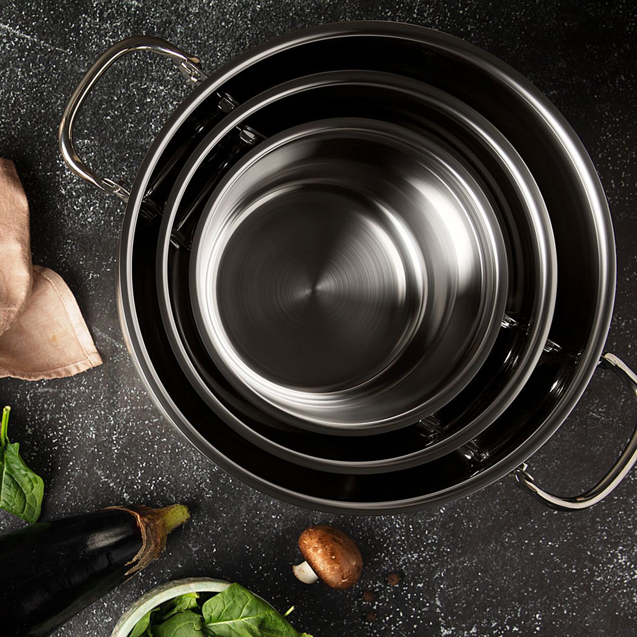 За счет трехкапсульного дна пища не пригорает, быстро и равномерно нагреваясь. Складные ручки кастрюль позволяют сложить предметы друг в друга, тем самым экономя кухонное пространство. Встроенный дуршлаг на крышках заметно упростит процедуру слива жидкости из кастрюль.