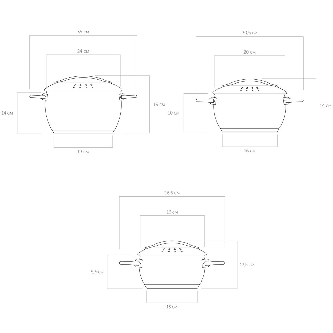 На внутренних стенках изделий расположена маркировка литража, что очень удобно, так как вы всегда сможете налить нужное количество жидкости. Крышки посуды, исполненные из закаленного стекла, имеют повышенную прочность, поэтому кастрюли можно использовать в духовке. Все предметы набора допустимо мыть в посудомоечной машине. Гарантия 10 лет.