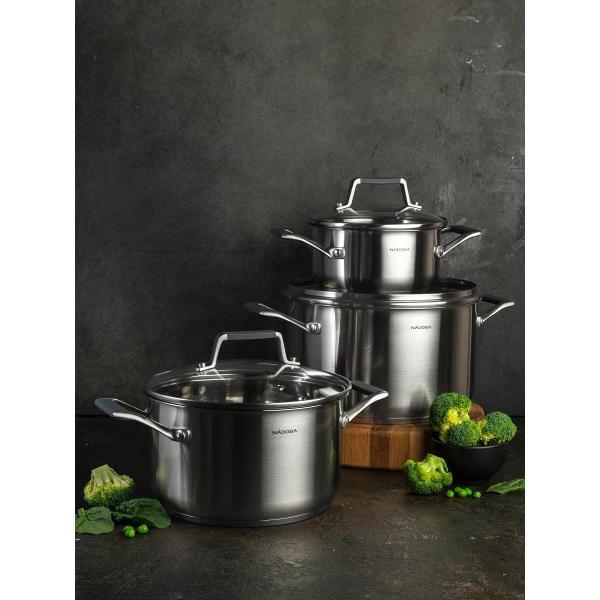 Трёхслойное капсульное дно способствует равномерному распределению тепла и предотвращает пригорание пищи, что делает процесс приготовления более комфортным и эффективным. Кастрюли подходят для всех типов плит — индукционных, газовых, электрических и стеклокерамических.