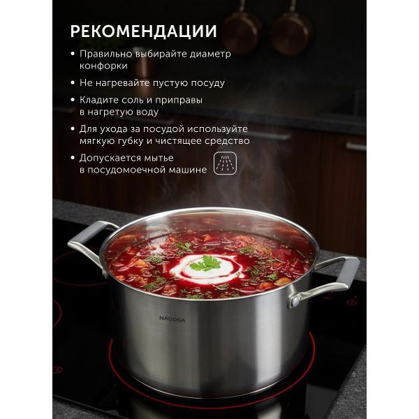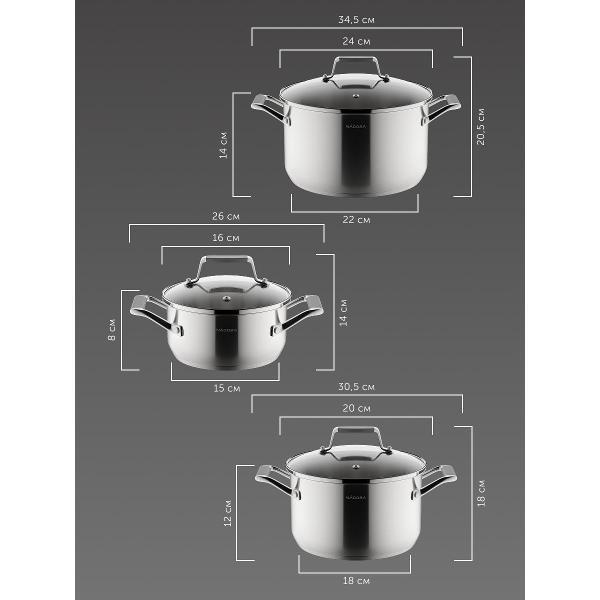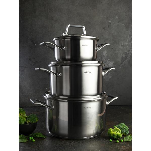 Посуда изготовлена из высококачественной нержавеющей стали 18/10, устойчивой к коррозии, воздействию кислот и щелочей. Благодаря оптимальному содержанию никеля и хрома кастрюли сохраняют блеск, форму и презентабельный внешний вид даже при ежедневном использовании. Толщина стенок 0,6 мм обеспечивает прочность и долговечность изделий.