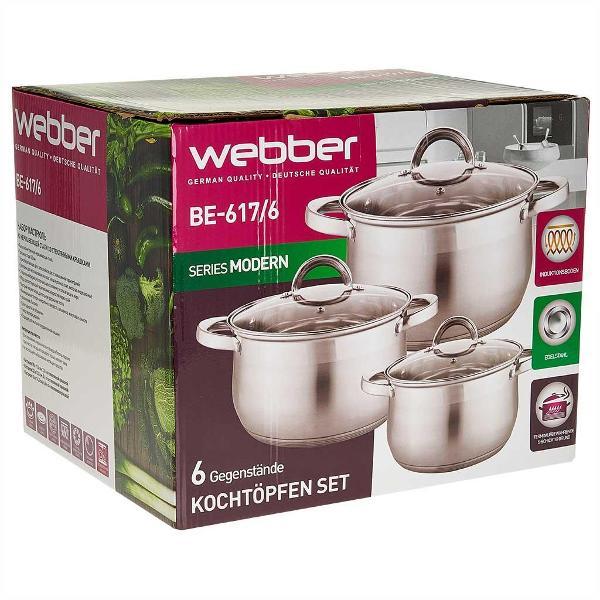 Набор кастрюль Webber BE-617/6 состоит из шести предметов. Пятислойное дно с термоотдачей равномерно распределяет тепло, обеспечивает быстрый нагрев. Корпус и ручка сделаны из нержавеющей стали серебристого цвета.