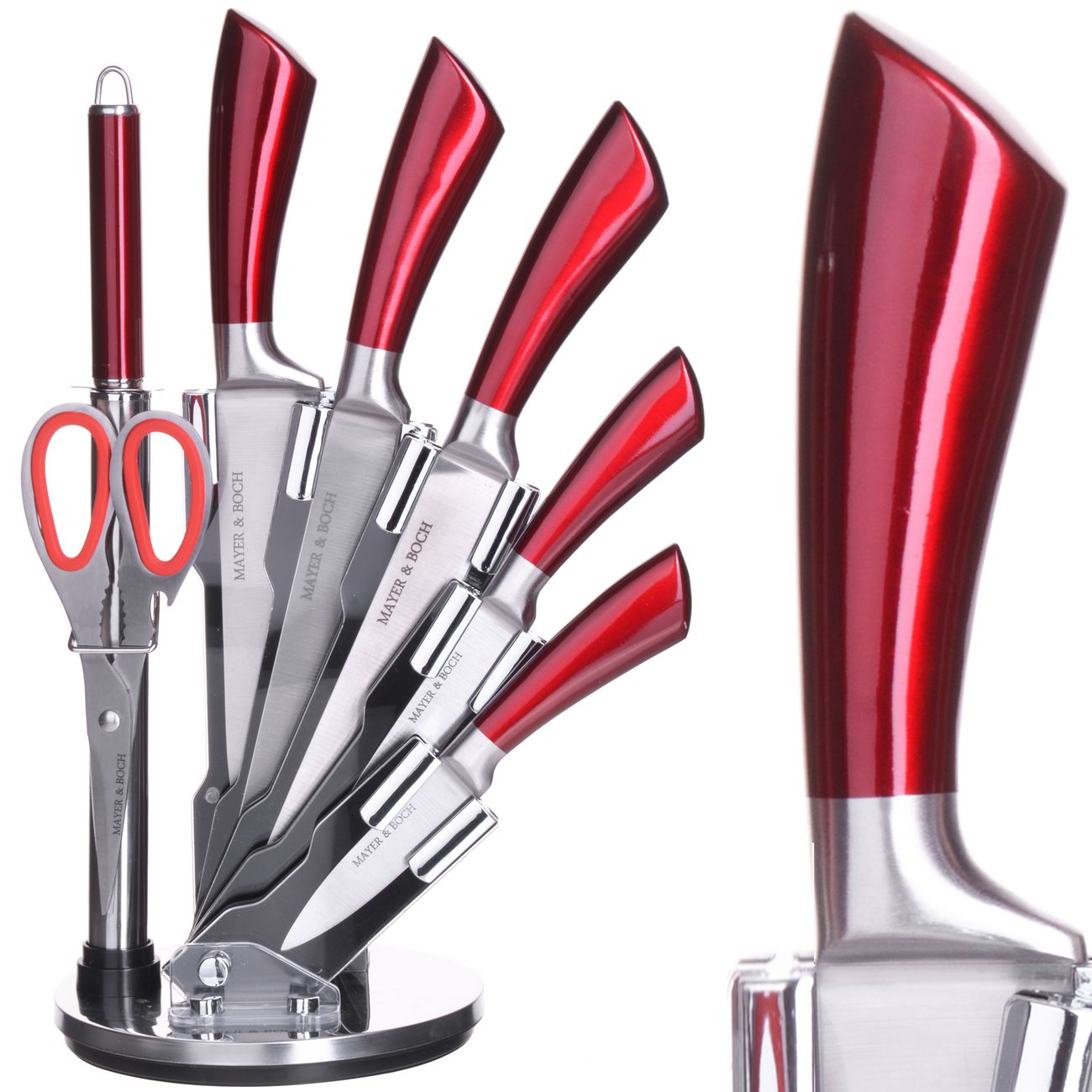 В набор Mayer & Boch 28755 входят пять ножей разных типов, мусат для их заточки и ножницы. Для хранения предусмотрена удобная подставка в виде веера.
