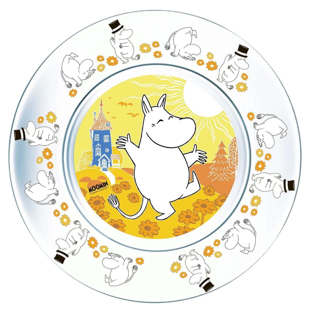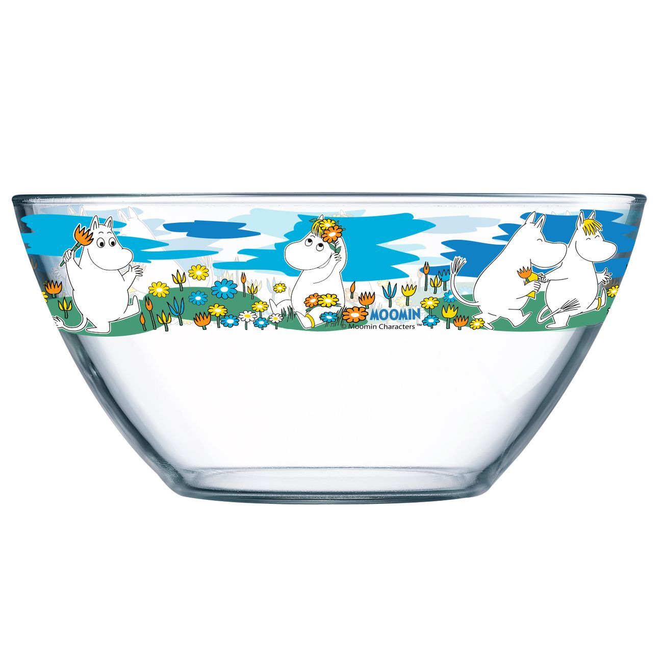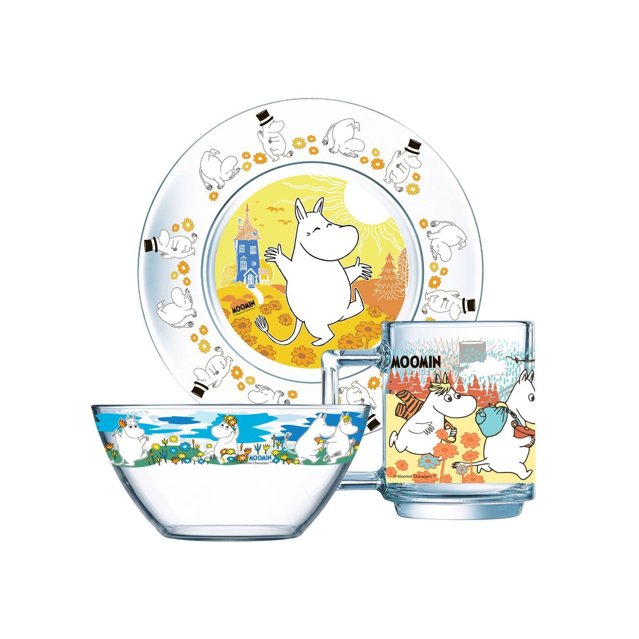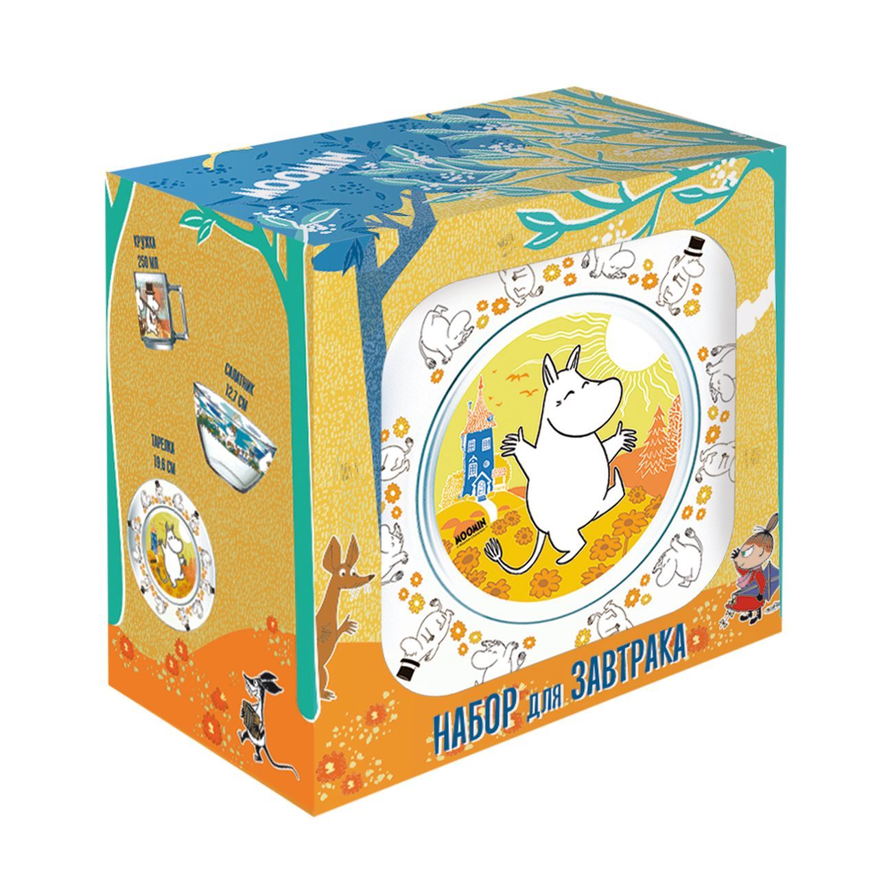 Набор Осз создан по мотивам популярного мультсериала Мумми-тролли. Он упакован в плотную подарочную коробку и содержит три предмета: плоскую тарелку, глубокую тарелку для вторых блюд или салата и кружку емкостью 200 мл. Посуда изготовлена из стекла и украшена изображениями любимых персонажей.