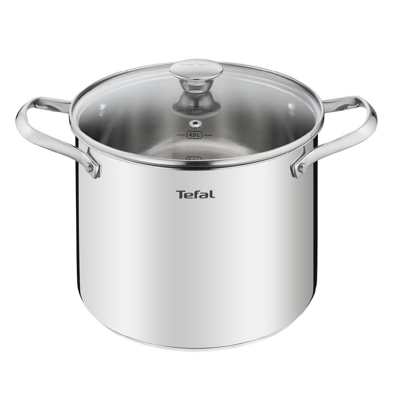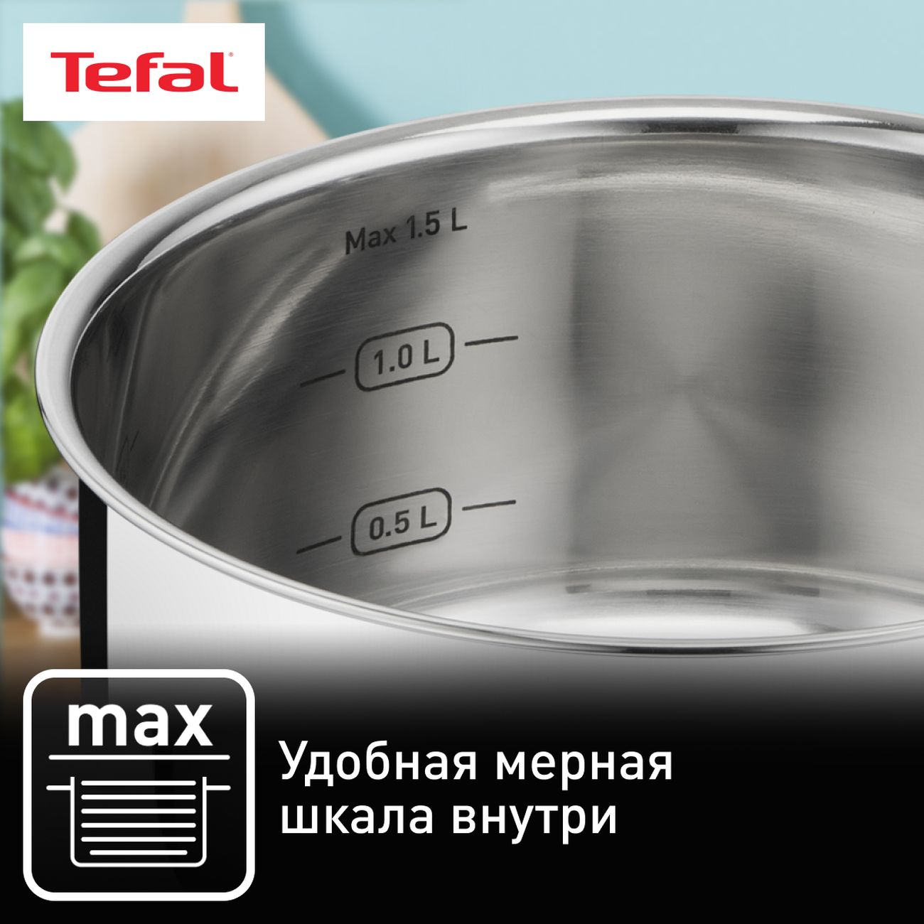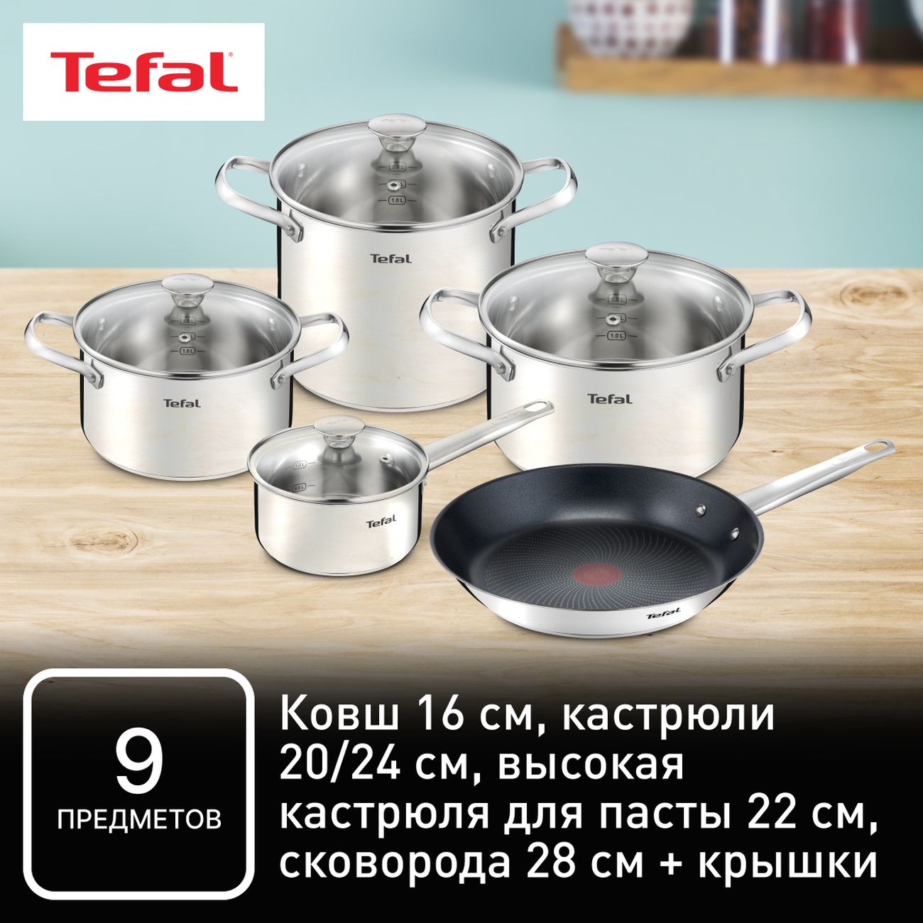 Набор посуды Tefal B922S955 изготовлен из нержавеющей стали с антипригарным покрытием. Комплект состоит из трех кастрюль объемами 3,1 л, 5,4 л, 6,4 л, ковша объемом 1,5 л, сковороды и четырех жаропрочных стеклянных крышек соответствующего диаметра. Каждая кастрюля оснащена индукционным дном, термоизолированными ручками и мерной шкалой.