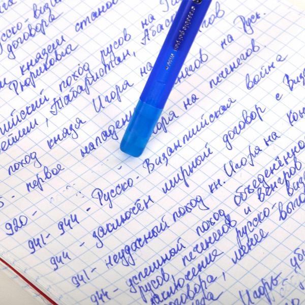 Ручка пишет особыми гелевыми чернилами синего цвета. Для удаления надписи её необходимо потереть специальным ластиком, встроенным в корпус ручки. При письме и стирании ручка не повреждает бумагу, поэтому исправления выглядят незаметными.