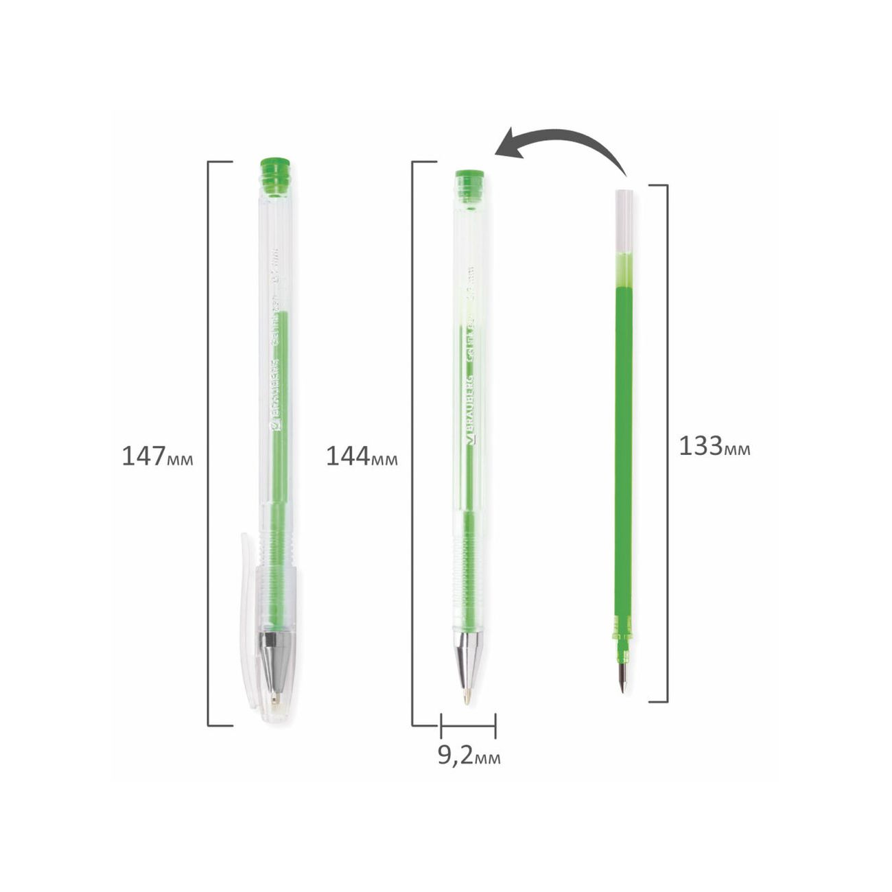 Набор Brauberg Jet включает 10 разноцветных ручек с гелевыми стержнями. Их корпус сделан из пластика, а в зоне захвата находится специальное рифление. Ручки многоразовые, пустые стержни можно заменять новыми. Диаметр пишущего узла составляет 0,7 мм и оставляет на бумаге линию толщиной 0,5 мм. Плотные колпачки надежно защищают чернила от высыхания и протечек.