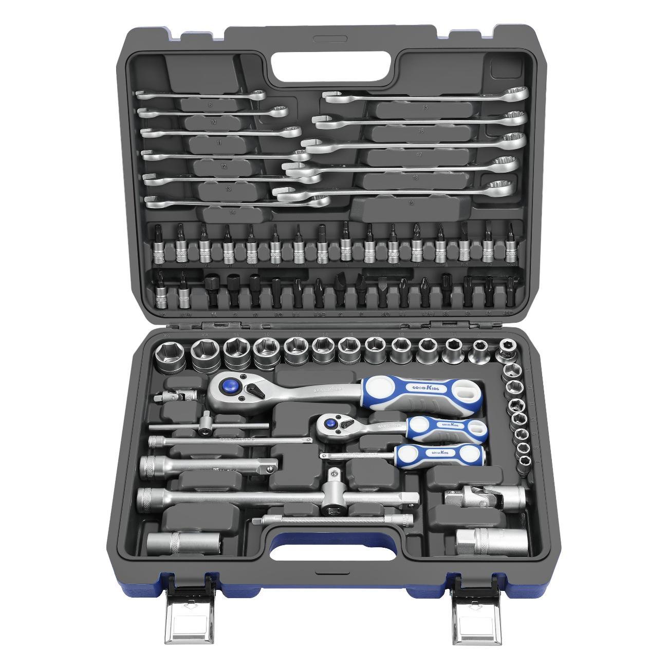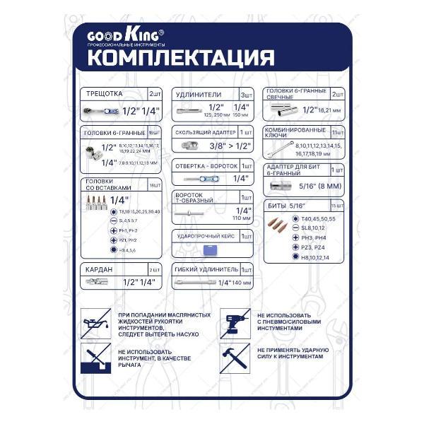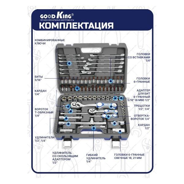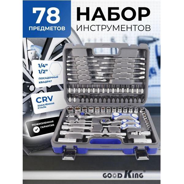 КомплектацияНабор состоит из 78 предметов:11 шт - Комбинированные ключи: 8, 10, 11, 12, 13, 14, 15, 16, 17, 18, 19 мм18 шт - Торцевые головки с наконечниками 1/4": биты-звёздочки Тогх: Т8, Т10, Т15, Т20, Т25, ТЗ0, Т40, шестигранные Femelle Нехаgon Нех: НЗ, Н4, Н5, Н6, удлинённые крестообразные Рozidriv: РZ1, РZ2, прямой шлиц Slot: S4, S5.5, S6.5, крестообразные Phillips: РН1, РН2, 15 шт - Насадки биты: шестигранные Femelle Нехаgon Нех: Н8, Н10, Н12, Н14, удлинённые крестообразные Pozidriv: РZЗ, РZ4, прямой шлиц Slot; S8, S10, S12, крестообразные Phillips: РНЗ, РН4, биты-звёздочки Тогх: Т40, Т45, Т50, Т55, 12 шт - Торцевые головки 1/2": 8, 10, 12, 13, 14, 15, 16, 17, 18, 19, 22, 24 мм7 шт - Торцевые головки 1/4": 7, 8, 9, 10, 11, 12, 13 мм1 шт - Адаптер под биты 3/8" на квадрат 1/2", 2 шт - Карданный шарнир: 1/2", 1/4"2 шт - Трещотка: 1/2" 1/4"1 шт - Удлинитель-вороток Т-образный 1/4" 115 мм, 1 шт - Удлинитель для торцевых головок 1/4" 150 мм1 шт - Удлинитель для торцевых головок 1/2" 125 мм1 шт - Отвертка-вороток 1/4", 2 шт - Удлинитель-вороток Т-образный 1/2" 250 мм: 5", 10"1 шт - Гибкий удлинитель 1/4" 125 мм2 шт - Торцевые головки свечные 1/2": 16, 21 мм1 шт - Пластмассовый чемодан