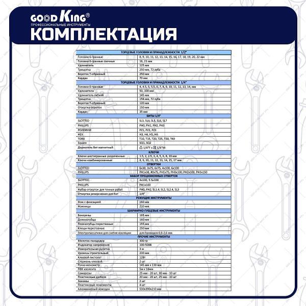 Вы можете купить Набор ручного инструмента GOODKING 187 предметов (11871) в магазинах М.Видео по доступной цене. Набор ручного инструмента GOODKING 187 предметов (11871): подробное описание, фото и отзывы реальных покупателей, характеристики, возможность скачать инструкции и подобрать аксессуары.