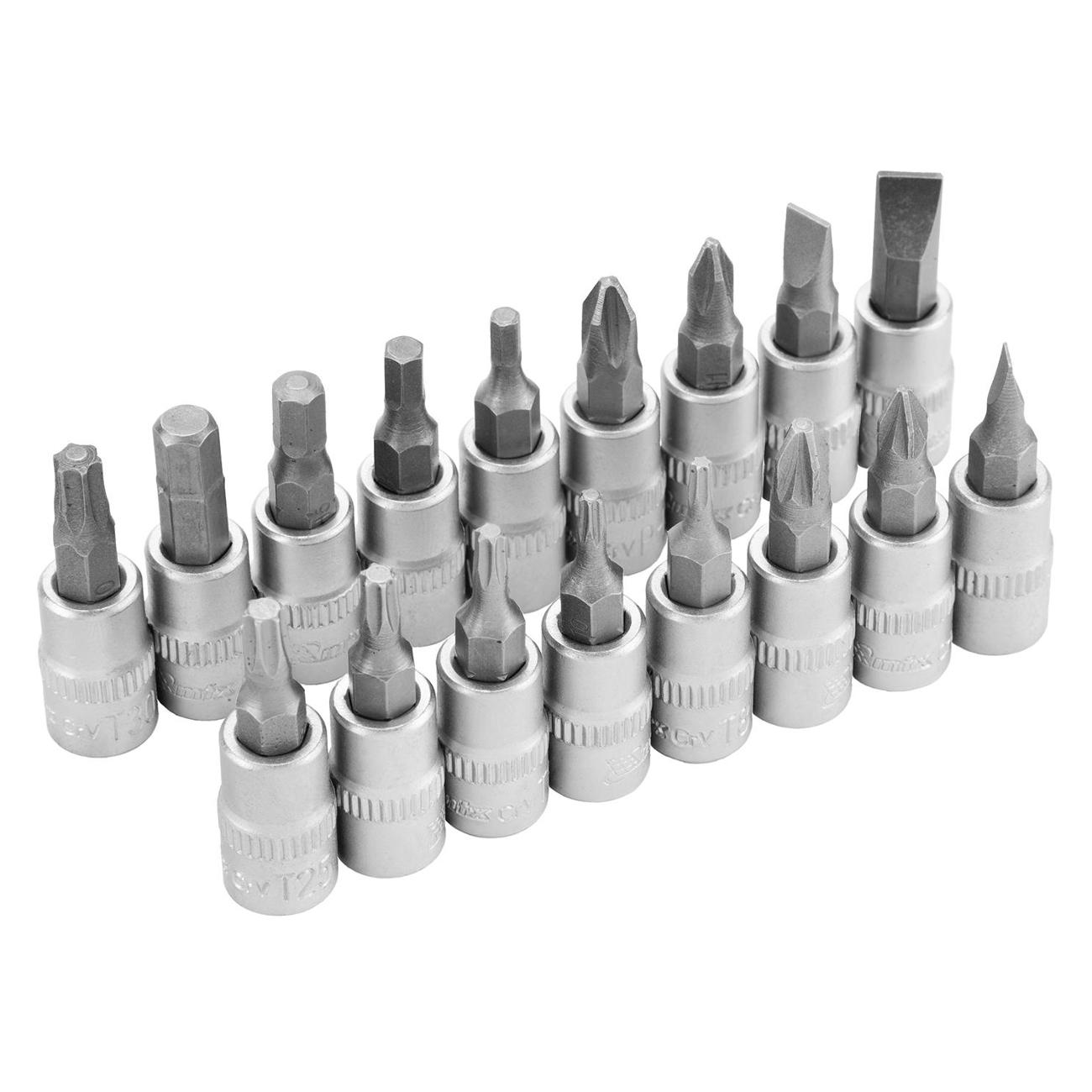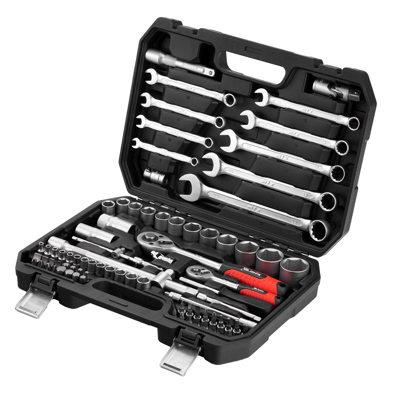КомплектацияКлюч-трещотка 1/2",1/4", Вороток Т-обр. 1/2",1/4" 250, 110 мм, Удлинитель 1/2" 125,250 мм, Удлинитель 1/4" 50,100 мм, Удлинитель гибкий 1/4" 145 мм, Адаптер 1/2"-3/8" 25 мм, Адаптер для бит 1/4" 25 мм, Кардан 1/2",1/4" 73,39 мм, Отвертка-держатель 150 мм, Головки свечные 1/2" 16,21 мм, ГоловкиТорц.1/2"14-20,22,24,27,30,32, Головки торцевые 1/4" 4-14 мм, Ключи комбинированные 8-22 мм, Биты с торц. Голов. 1/4"H3,H4,H5,H6, БитыТорГол1/4"T8,T10,T15,T20,T25,T30, БитыТорцГол1/4"SL4,SL5.5,SL7, БитыТорцГол1/4"PH1,PH2, БитыТорцГол1/4"PZ1,PZ2, Биты-вст5/16"T40,T45,T50,T55;PZ3,PZ4, Биты-вст.5/16"SL8,SL10,SL12;PH3,PH4, Биты-вставки 5/16" H8,H10,H12,H14
