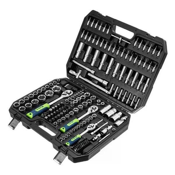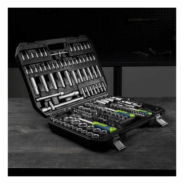 КомплектацияГоловки 1/4":4, 4.5, 5, 5.5, 6, 7, 8, 9, 10, 11, 1, Головки Torx 1/4": Е4, 5, 6, 7, 8, Головки удлин. 1/4": 4, 5, 6, 7, 8, 9, 10 мм, Вороток 110 мм, Рукоятка 150 мм, Биты: SL:4, 5.5, 6.5, 7 мм; PH:1, 2, 3; PZ:1, 2, 3, Шестигр:3, 4, 5, 6 мм; T8, 9, 10, 15, 20, 25, 27, Головки 3/8": 10, 11, 12, 13, 14, 15, 16, 17, 18, Головки Torx 3/8": Е10, 11, 12, 14, 16, 18, Головки свеч. 3/8": 18 мм, Переходники 3/8", 1/2", Головки Torx 1/2": Е20,24, Головки удлин. 1/2": 16, 17, 18, 19, 22 мм, Головки свеч. 1/2": 16, 21мм, Удлинители 1/2",3/8",1/4", Трещотка 1/2", 1/4", 3/8", Ключ шестигранный 1.25, 1.5, 2, 2.5, 3, 4, 5мм, Биты 6.3 х 25мм. Шарнир 1/2",3/8",1/4", Вставки 5/16": SL:8, 10, 12 мм; PH:3,4; PZ:3,4, Головки удлиненные 3/8": 10, 11, 12, 13, 14, 15 мм