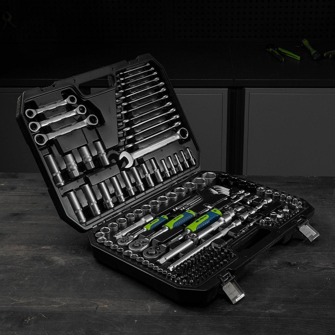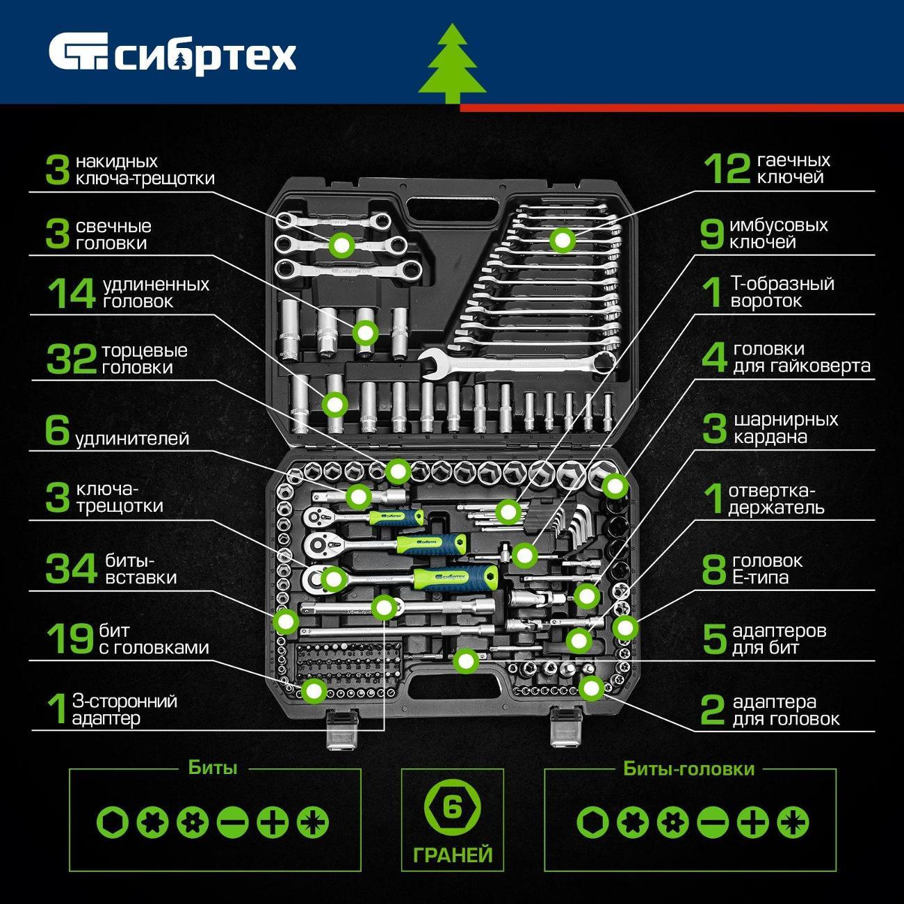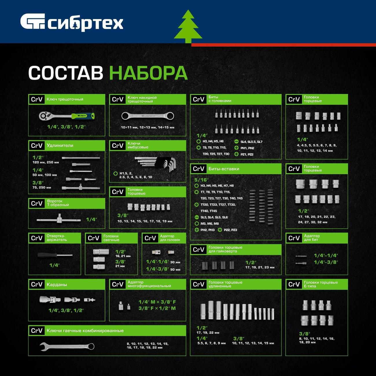 КомплектацияАдаптер: 3/8"F×1/2"M, 1/2F×3/8M, Биты с торцевыми головками 1/4" 19 шт., Биты-вставки 61 шт., Удлинитель 1/2", 1/4", 3/8" 6 шт., Вороток Т-образный 1/4": 110 мм, Головки свечные 1/2": 16, 21 мм, Головки свечные 3/8": 21 мм, Головки торцевые ударные 1/2" 4 шт., Головки торцевые 1/2" 10 шт., Головки торцевые 1/4" 13 шт., Головки торцевые 3/8" 16 шт., Головки торцевые удлинен. 1/2" 3 шт., Головки торцевые удлинен. 3/8" 6 шт., Головки торцевые удлинен. 1/4" 5 шт., Кардан 1/4", 3/8", 1/2" 3 шт., Ключ трещотка 1/4", 3/8", 1/2" 3 шт., Ключи имбусовые 10 шт., Ключи комбинированные 12 шт., Отвертка держатель 1/4": 150 мм, Ключи накидные трещоточные 3 шт., Переходники для бит 3 шт.