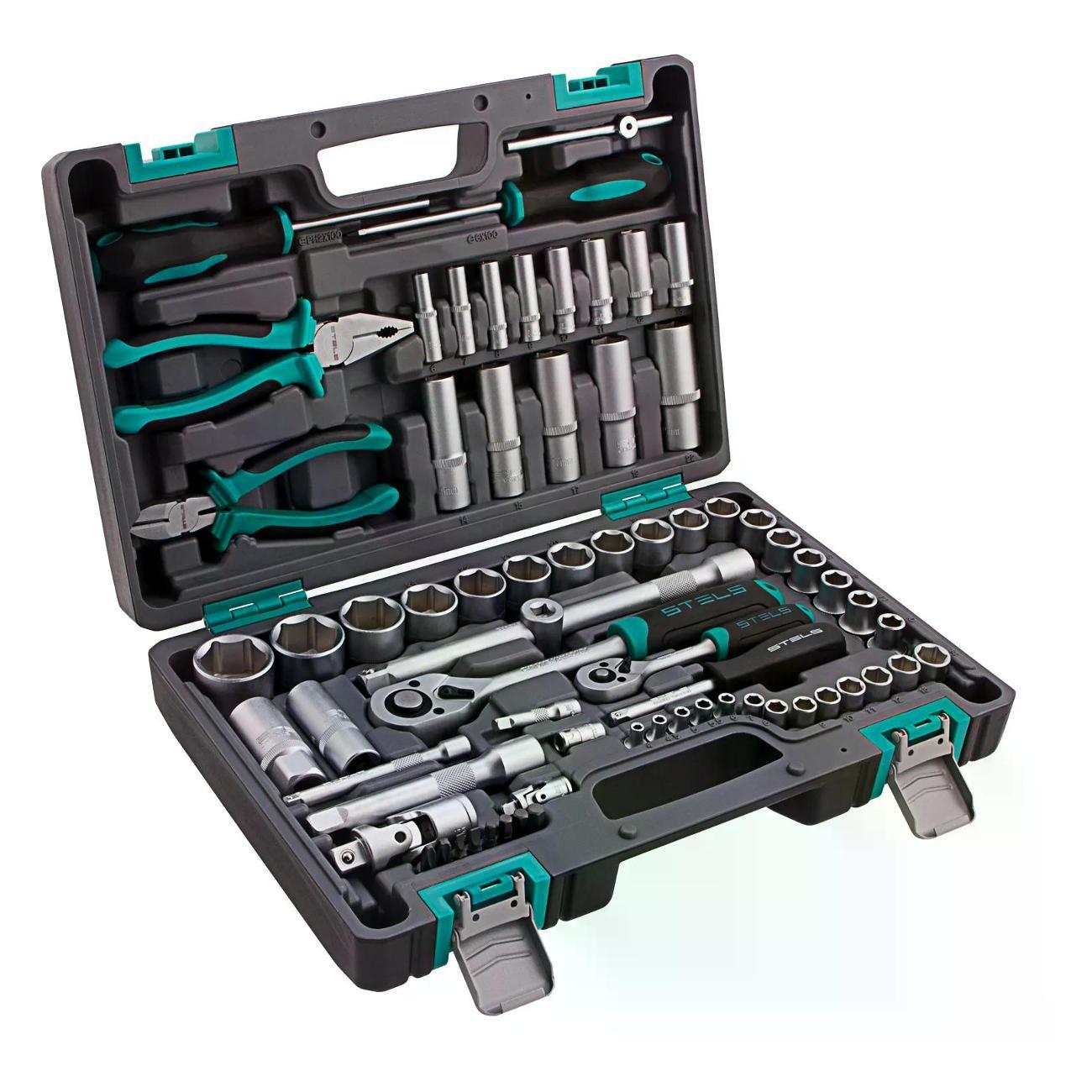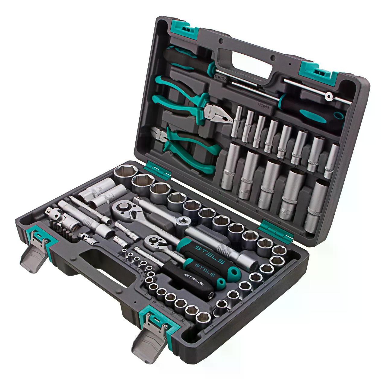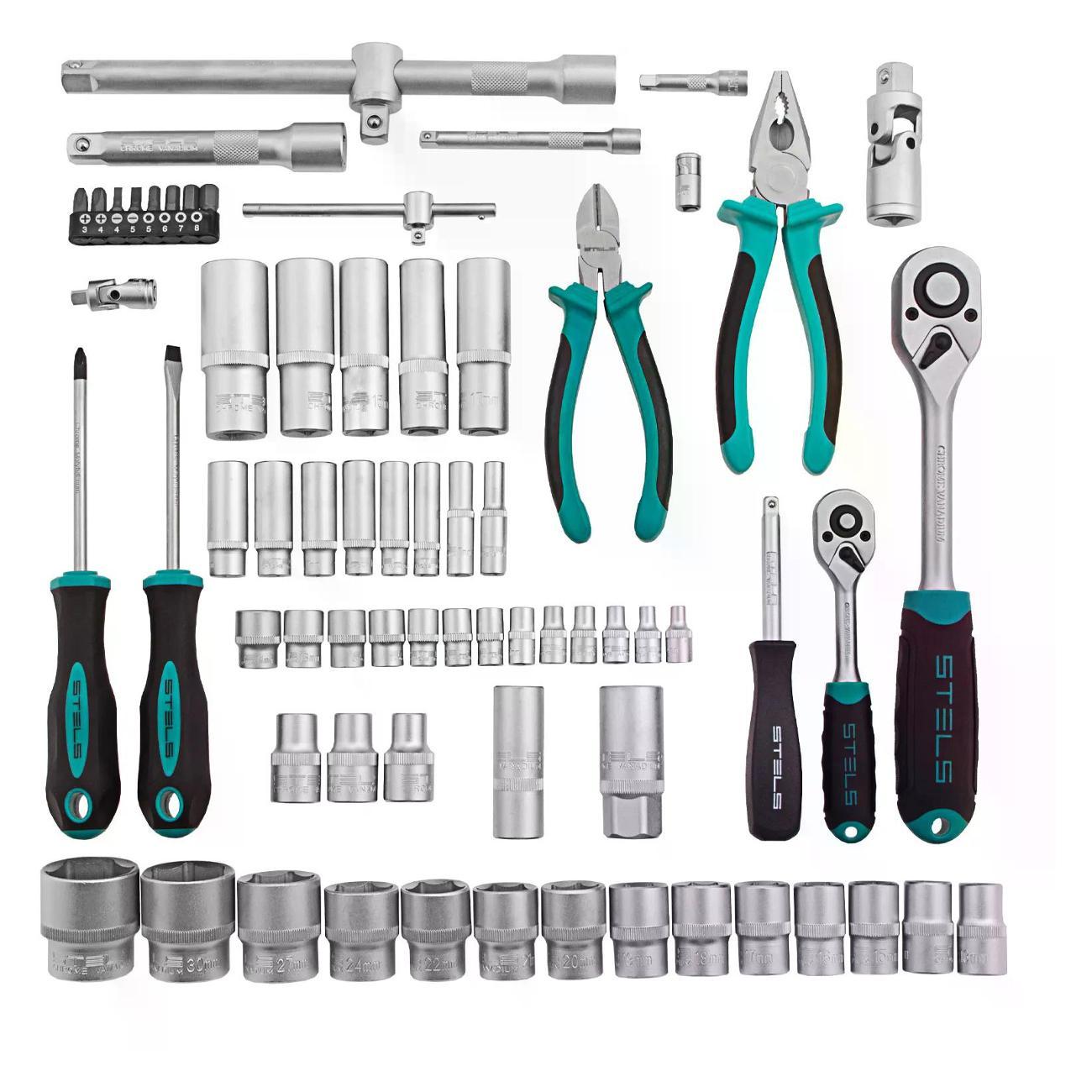 КомплектацияАдаптер для бит, Биты PH, SL, H 8 шт, Головки 4, 4.5, 5, 5.5, 6, 7, 8, 9, 10, 11, 12, 13, 14, 15, 16, 17, 18, 19, 20, 21, 22, 24, 27, 30, 32, Отвертка-держатель, Отвертка PH, SL, Головки удлиненные 6, 7, 8, 9, 10, 11, 12, 13, 14, 15, 17, 19, 22, Бокорезы, Удлинитель 4 шт, Головки свечные 16, 21, Ключ трещoточный 2 шт, Кардан 2 шт, Адаптер, Плоскогубцы, Вороток Т-образный