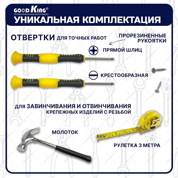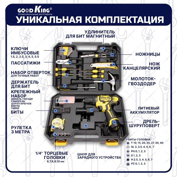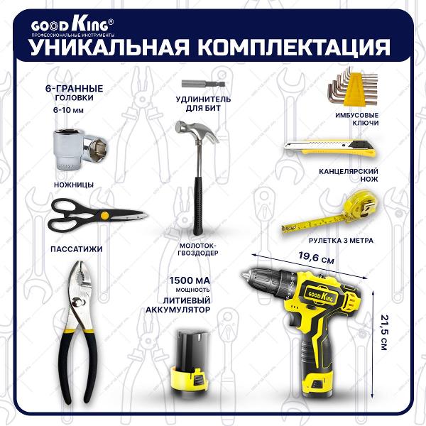 Аккумуляторная дрель Goodking EC-1202104 предназначена для строительства, ремонта и работ с крепежными элементами. Наибольшие размеры сверления: сталь — 8 мм, бетон, камень, кирпич — 10 мм, древесина — 20 мм. Наибольшее количество оборотов достигает 1550 об/мин. Предусмотрена возможность электронной регулировки оборотов и функция обратного хода. Предельный крутящий момент составляет 28 Н.м. Уровень шума при работе не превышает 72 дБ.