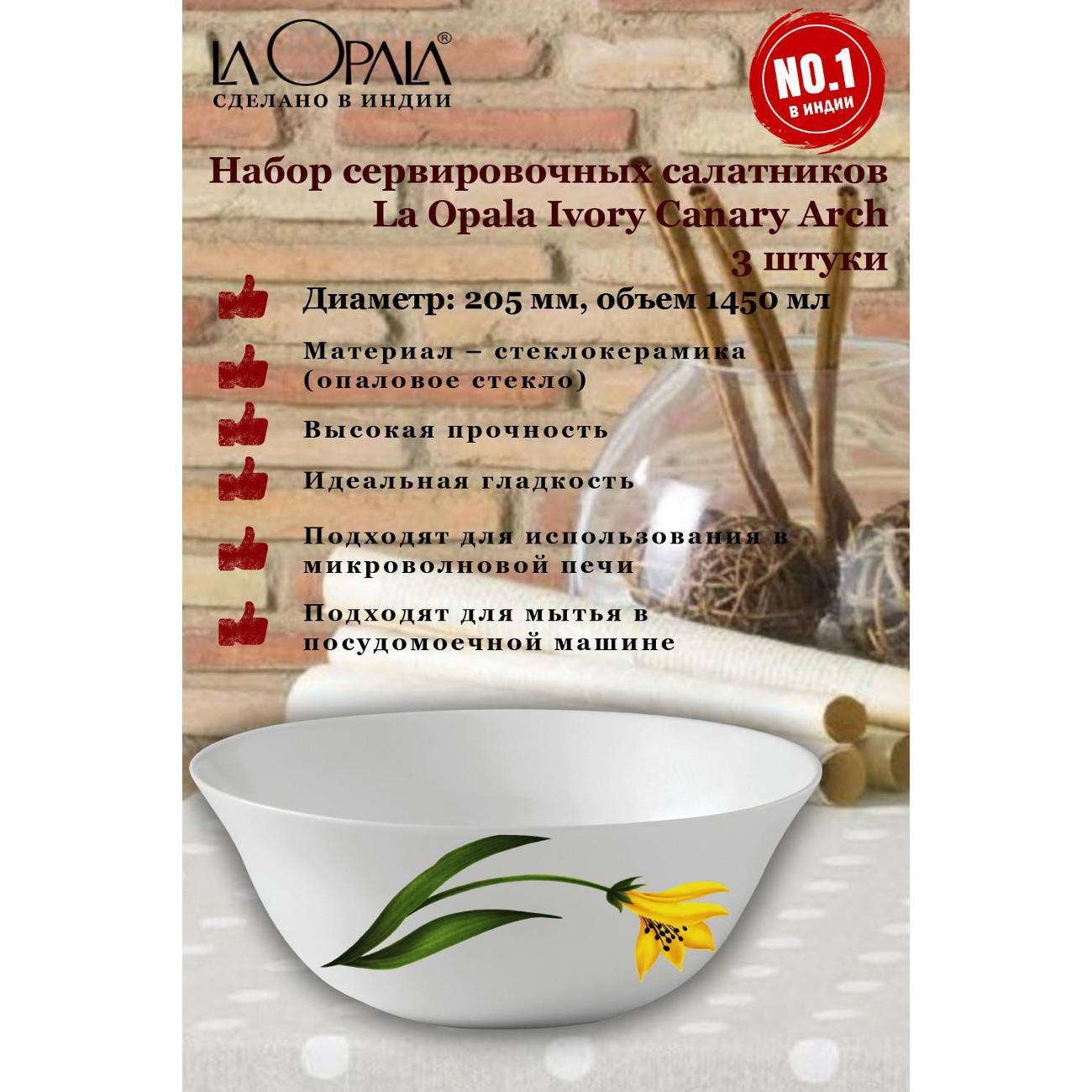 Вы можете купить Набор салатников LA OPALA Ivory, Canary Arch, 205 мм, 3 шт в магазинах М.Видео по доступной цене. Набор салатников LA OPALA Ivory, Canary Arch, 205 мм, 3 шт: подробное описание, фото и отзывы реальных покупателей, характеристики, возможность скачать инструкции и подобрать аксессуары.