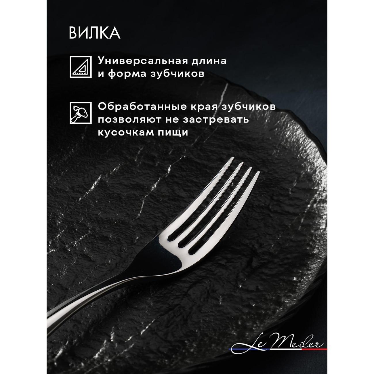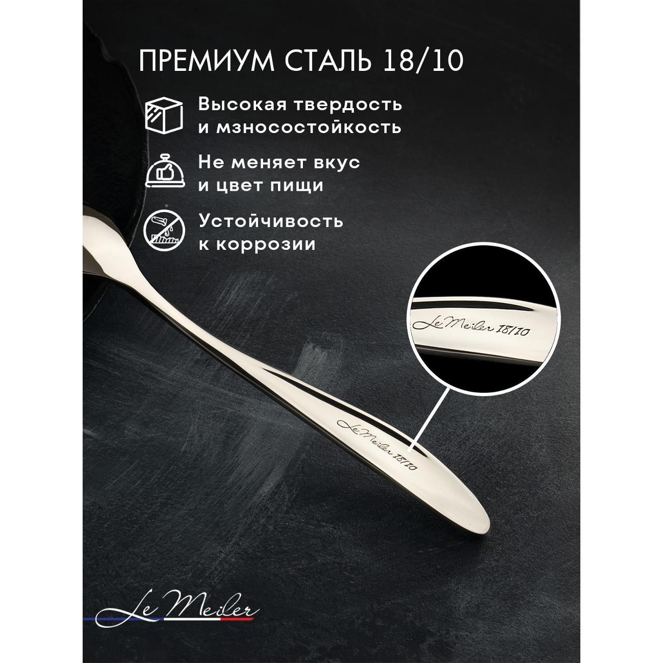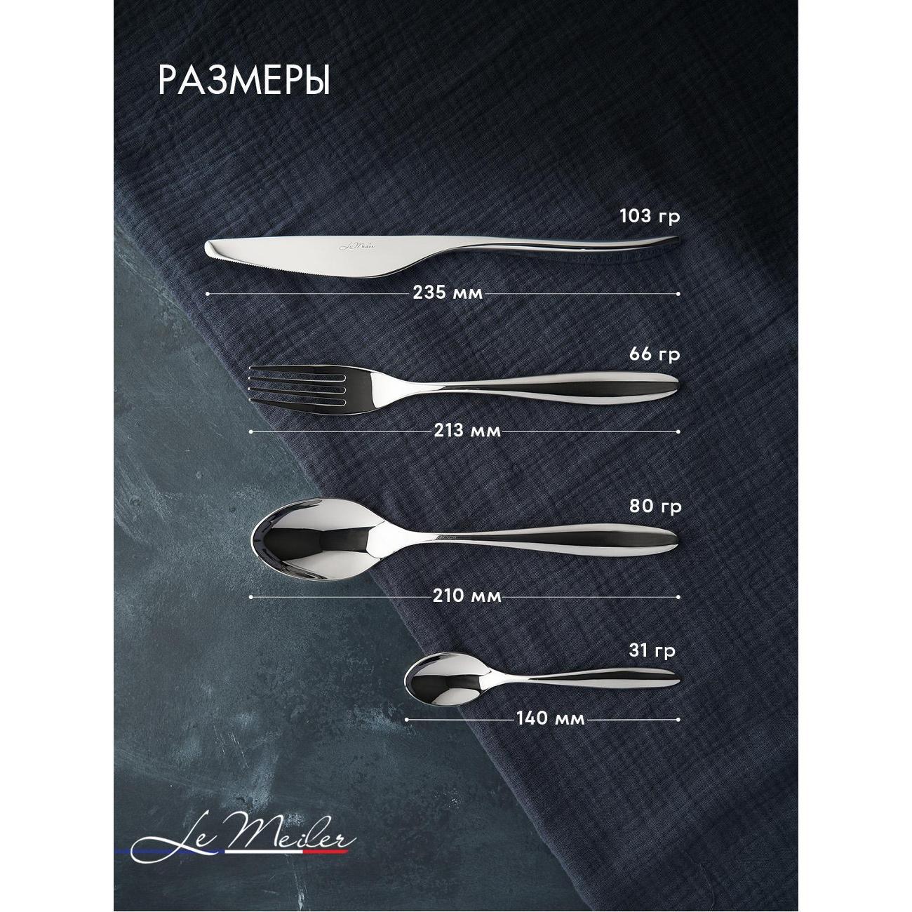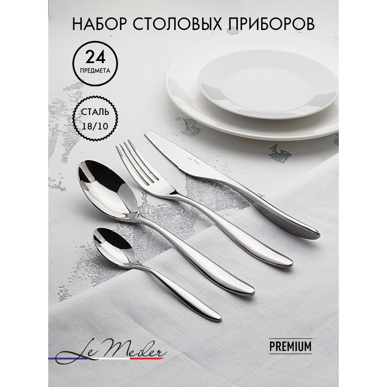 Современный и стильный набор серебристых столовых приборов из гипоаллергенной нержавеющей стали 18/10 на шесть персон (24 предмета) Le Meiler FS-420. Столовые приборы из нержавеющей стали подойдут как для личного пользования, так и в подарок на любой праздник.