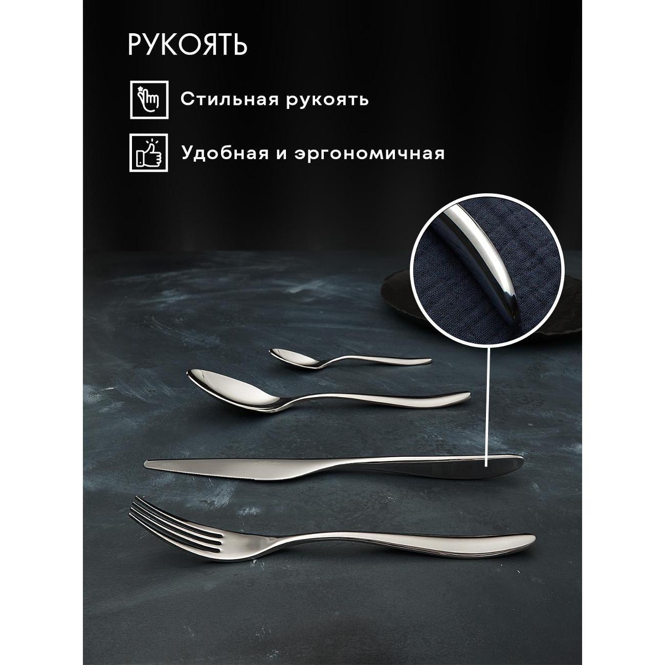 Дизайн приборов отлично дополнит любой кухонный интерьер и добавит эстетическое удовольствие во время приема пищи. Современный и стильный набор столовых приборов покорит Вас не только своим внешним видом, но и комфортом в использовании. Идеально подойдёт для сервировки праздничного стола и повседневного использования.