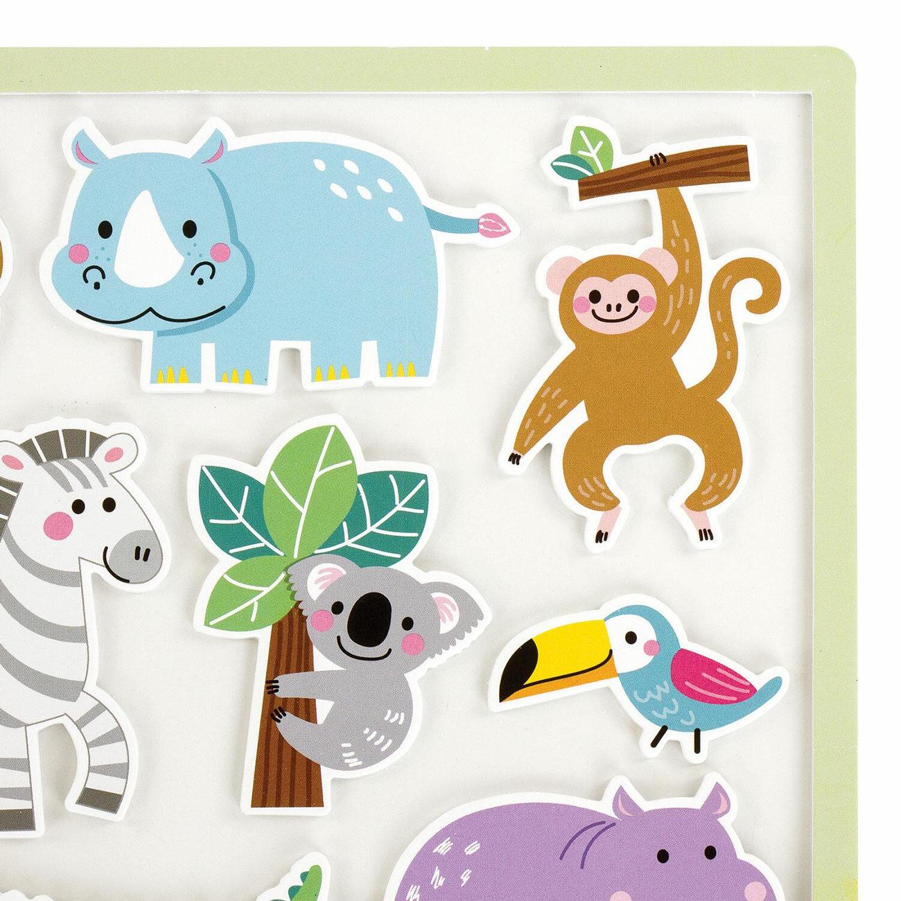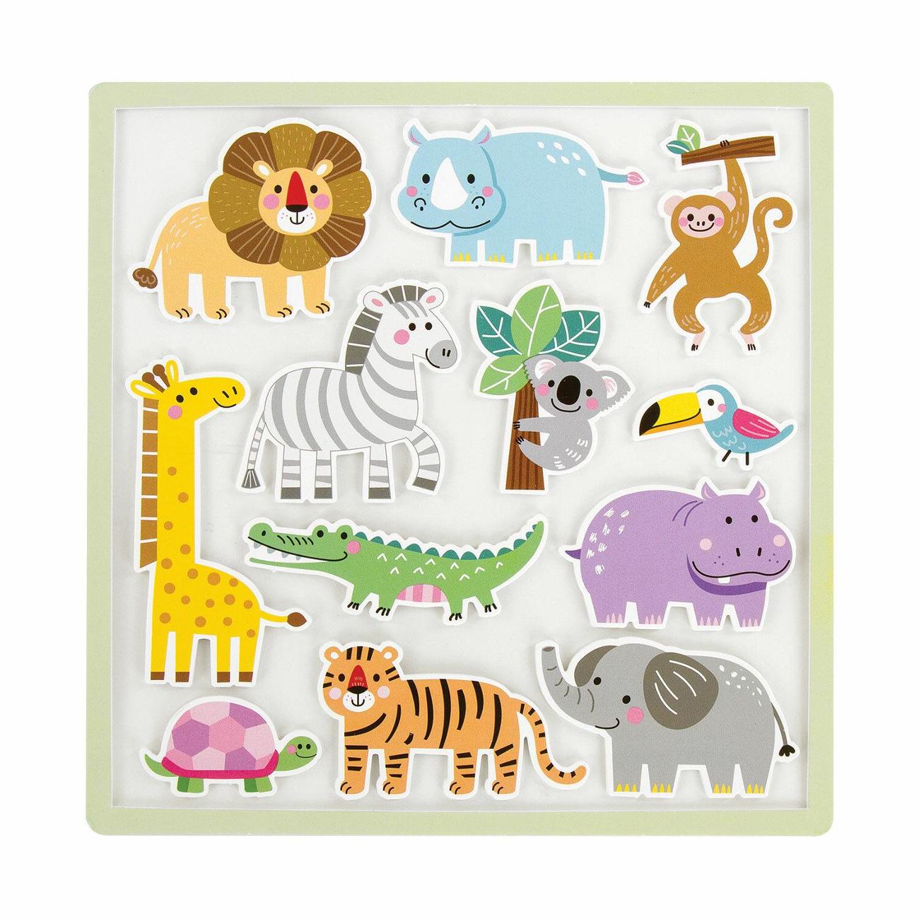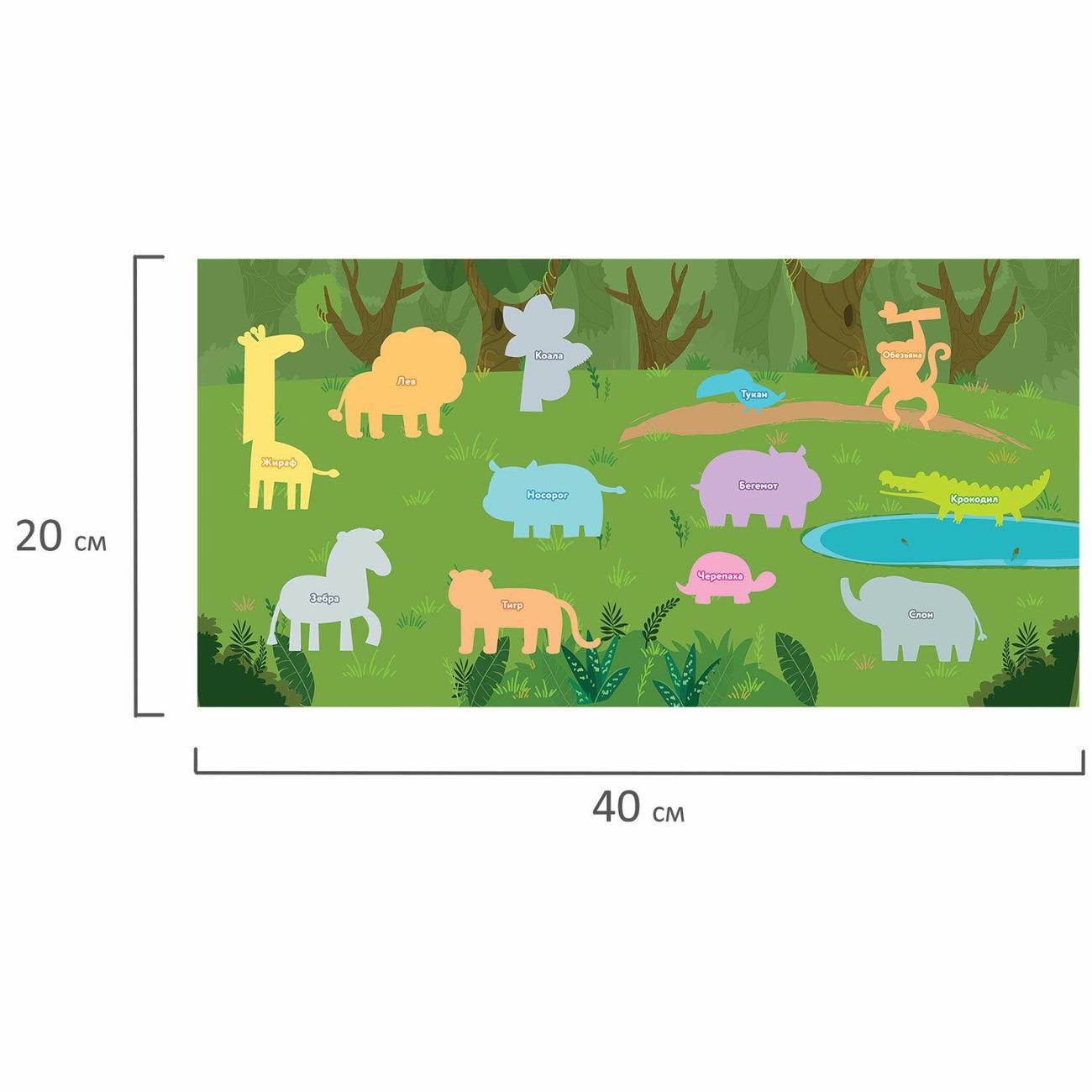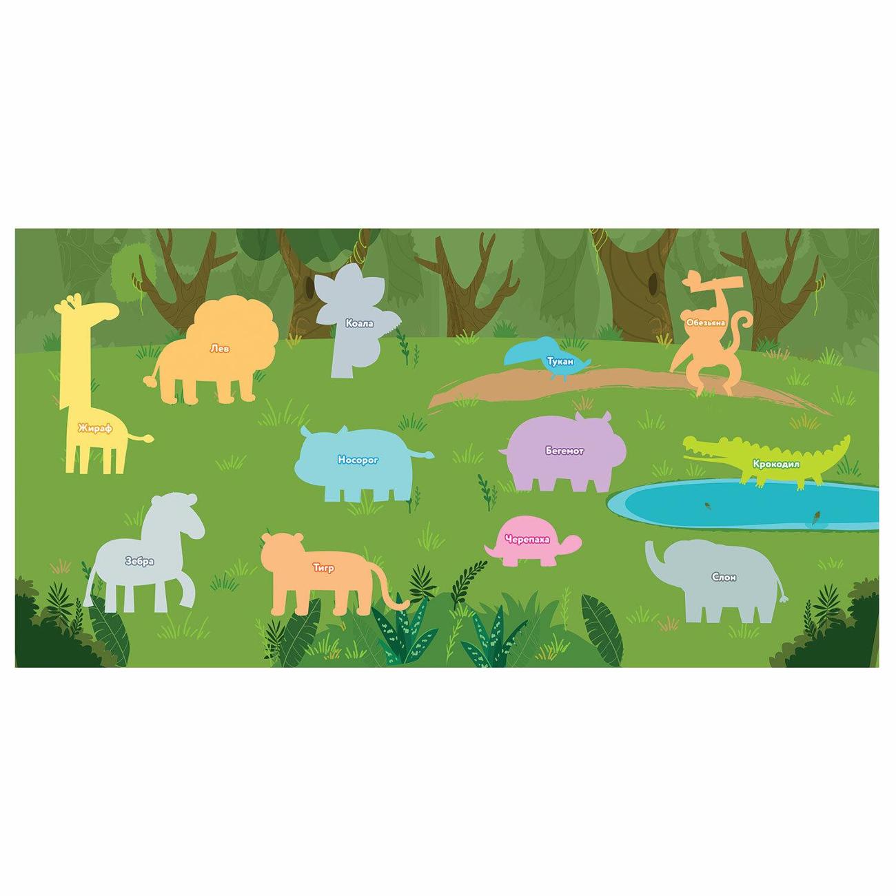В набор входит 12 крупных объемных наклеек в виде различных животных Африки, а также картонное поле размером 20*40 см (поставляется в сложенном виде) с определенными местами для нанесения наклеек. Место для каждой наклейки на поле подписано соответствующим образом, например, лев, жираф, зебра и т.д. Таким образом, в ходе игры ребенок знакомится с названием и внешним видом животного.