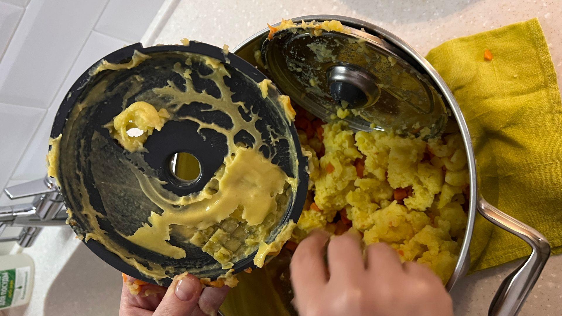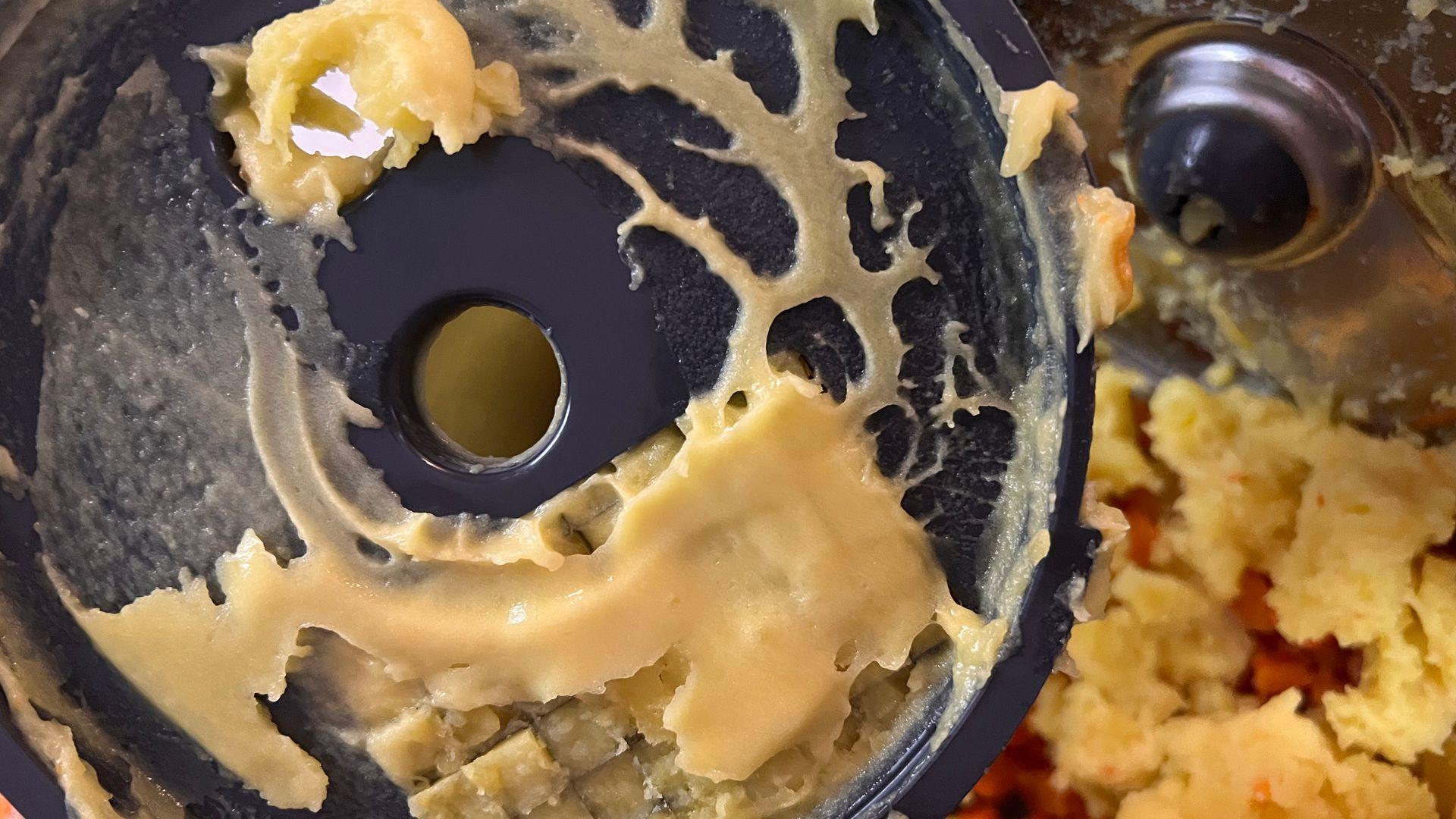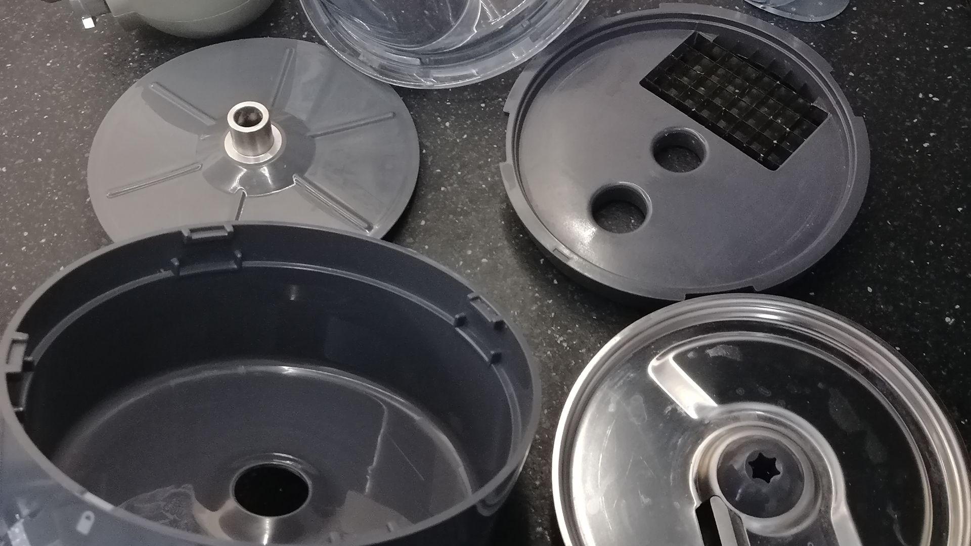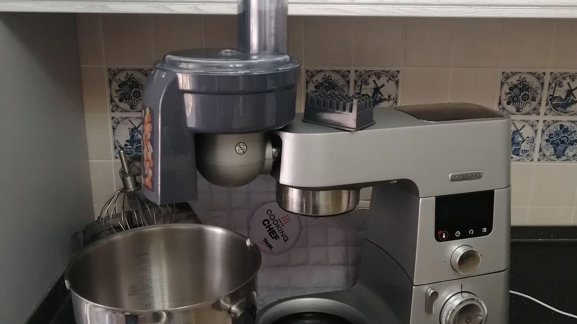 Покупали всю машину только в основном из-за этой насадки кубиками и из-за блендера. В результате эта насадка, как и шинковка, мало того, что не выполняют поставленную задачу, так еще и пальцев можно лишиться. Четыре глубоких пореза только при попытке снять-одеть-помыть насадку. У настоящего кенвуда все легко и интуитивно снимается, вкручивается итд. Тут- в пазы попадает с раза 17-го. А сами кубики можно увидеть на фото!!!! Картофель превратил в клей, который еле отмочили от насадки. Лезвие основное с браком- гнутое и ржавое. Буду оформлять возврат в магазине.