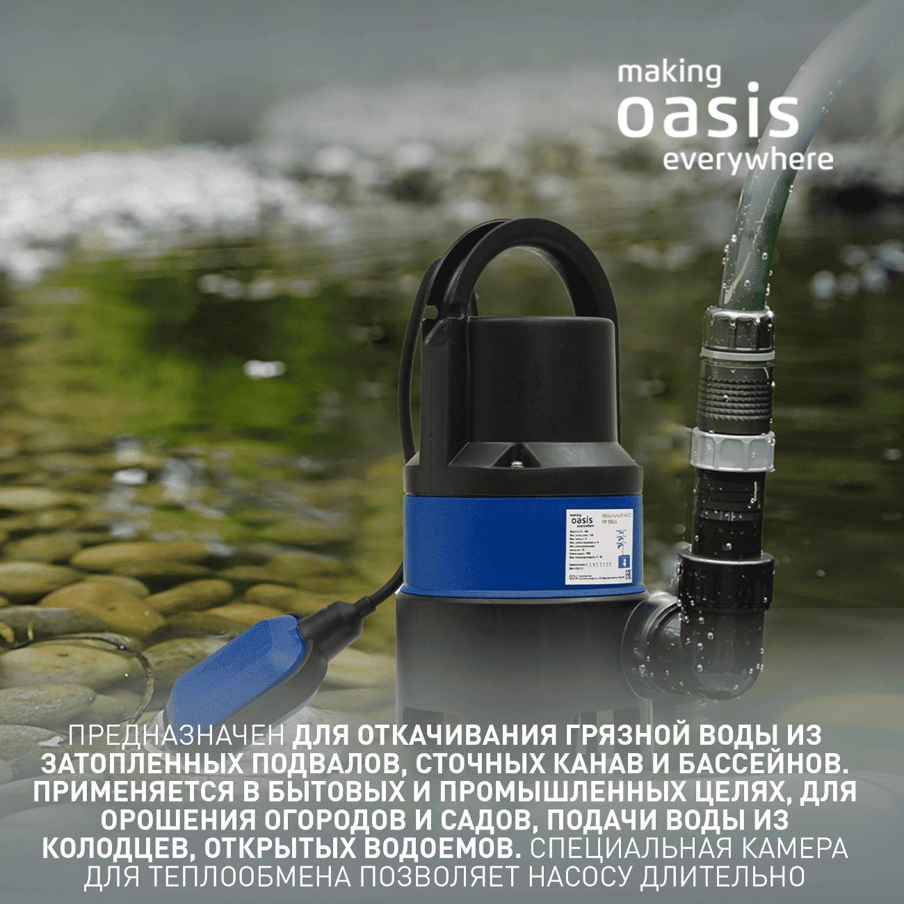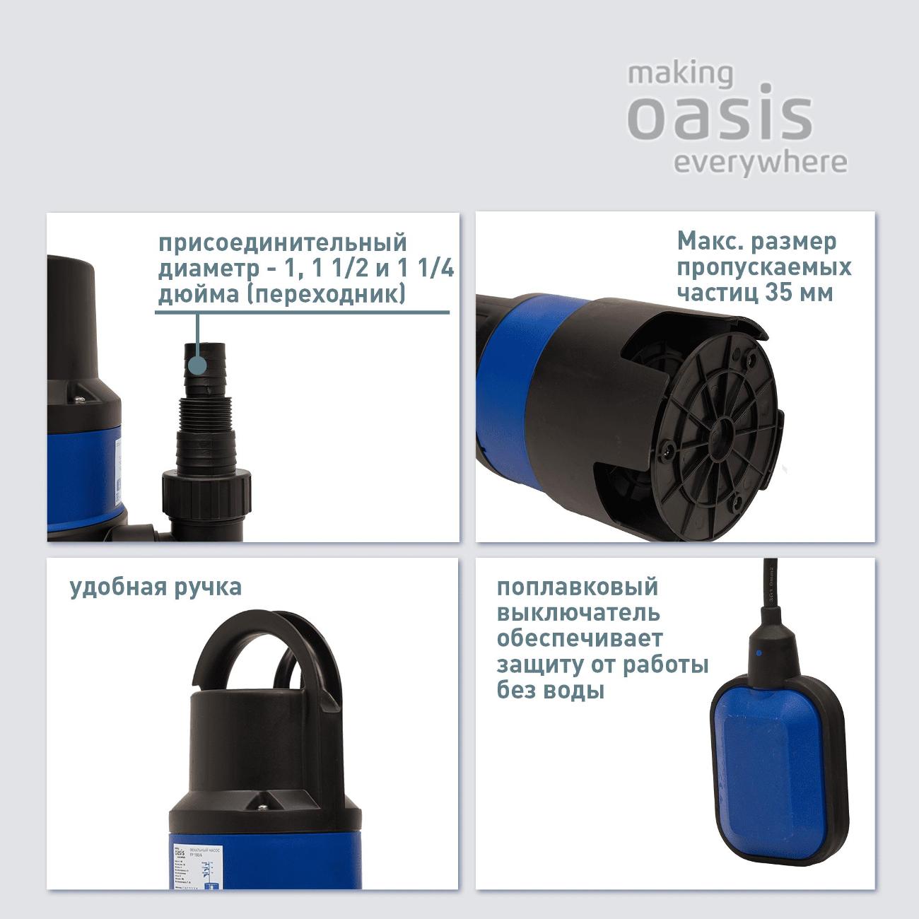 Дренажный насос making Oasis everywh FP 150/6 в комбинированном корпусе синего и черного цветов обладает габаритами 30х15х14 см. Масса устройства составляет 3,55 кг. Уровень давления достигает 60 дБ. Уровень потребляемой мощности составляет 400 Вт. Длина встроенного сетевого кабеля — 6 м. Рекомендованная температура воды варьируется от 4°С до 35°С. Модель обладает электрическим мотором.