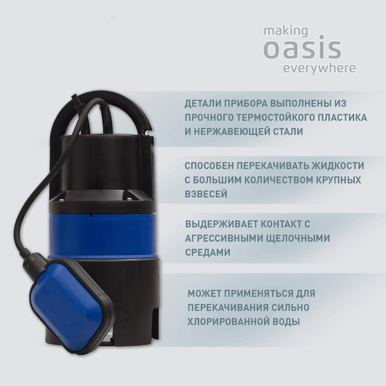 Предусмотрена возможность вертикальной установки. Инструмент оснащается системами защиты от перегрева и сухого хода. Диаметр насоса — 4,7 мм. Корпус устройства защищен по стандарту IPX8. Максимальное давление воды — 0,5 бар. Номинальная мощность прибора — 400 Вт. Напор достигает 6 м.